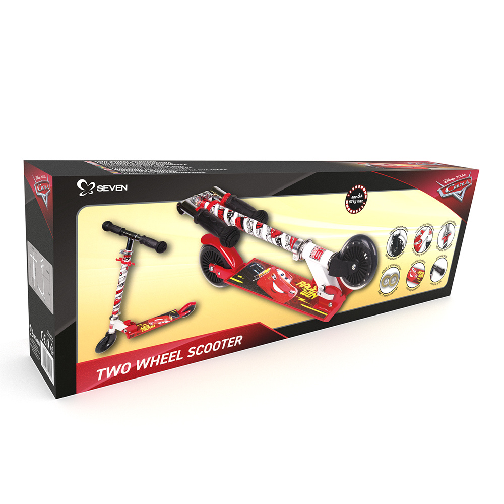 Dvoukolová koloběžka je ideální pro venkovní hry. Barevné postavičky z Disneyho kreslených filmů udělají řízení pro vaše dítě zábavné. Velký rozsah nastavení řídítek usnadňuje jízdu na koloběžce větším i menším dětem. Gumové úchyty zvyšují pohodlí, platforma je zesílena protiskluzovým materiálem chránícím proti uklouznutí. Polyuretanová kola (tvrdost 80 A) zvyšují odpružení při jízdě na nerovných površích a vysoce kvalitní ložiska ABEC-7 zajišťují plynulou jízdu. Koloběžka má nožní brzdu pro zvýšenou bezpečnost a snadný, pohodlný skládací systém.
