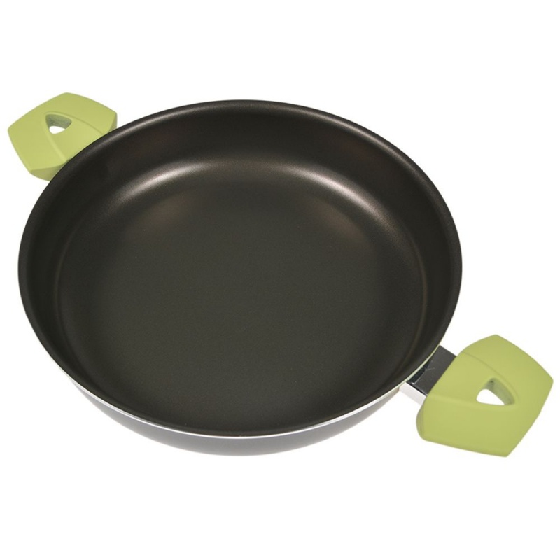 Pánev 24 cm bez poklice od italské značky Moneta™ Vyrobeno v Itálii Teflonový povrch Materiál hliník Extrémně odolný proti poškrábání. Pogumované rukojeti v zelené barvě. Vhodné na všechny typy povrchů mimo indukčního. Vhodné do myčky na nádobí. Rozměr: 24 x 5.5 cm, objem: 1.8l, váha: 650 g.