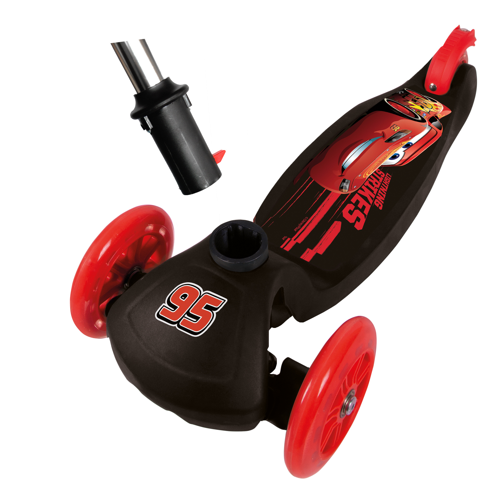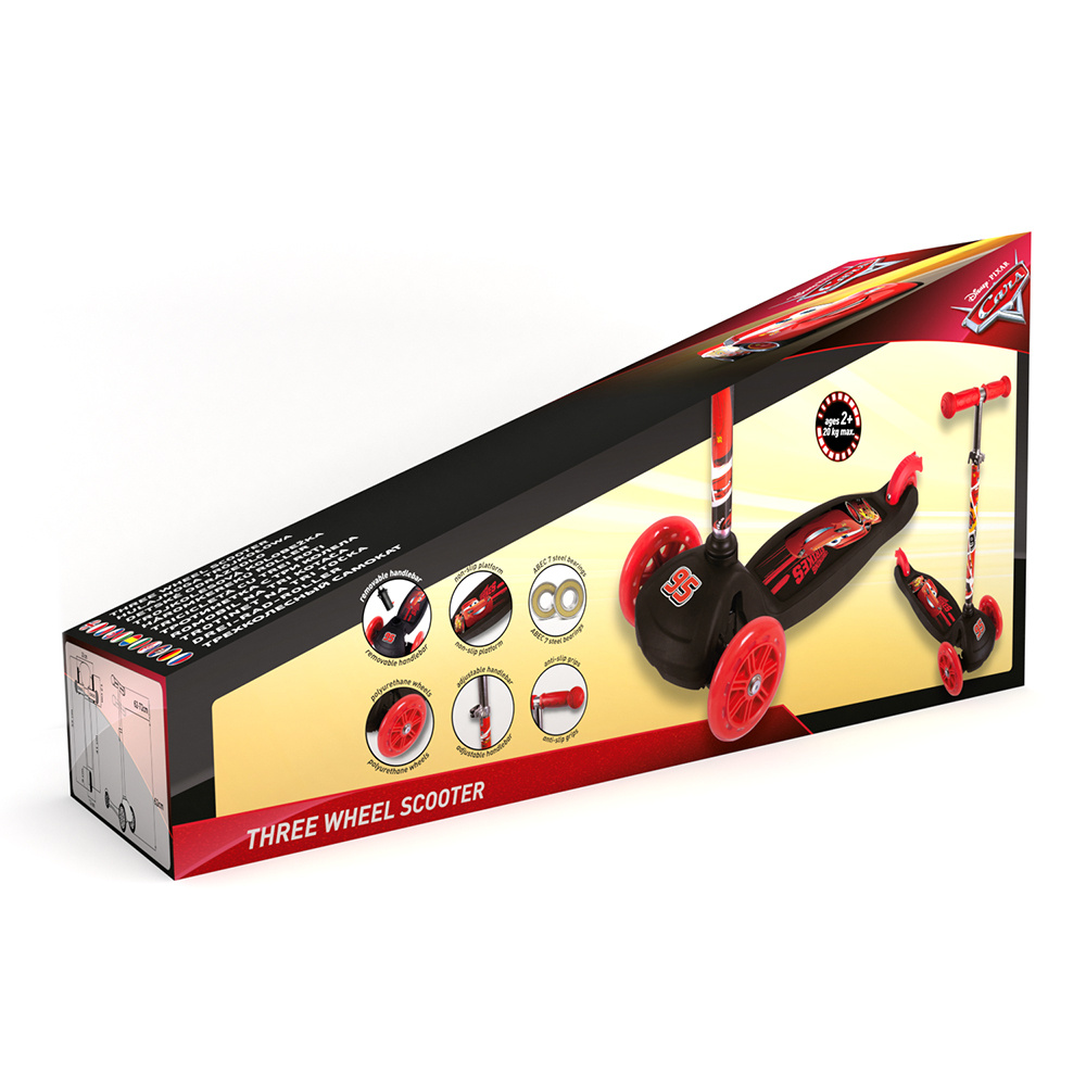 Koloběžka je ozdobena oblíbenými postavami z pohádek Disney, což dokonale rozvíjí dětský smysl pro rovnováhu. Díky nastavitelné výšce volantu je navržen jak pro kojence, tak pro starší děti. Unikátní mechanismus řízení umožňuje dítěti bezpečně vyvažovat své tělo během jízdy. It has a wide, reinforced base with a non-slip surface, and the construction is very durable. Polyuretanová kola zlepšují odpružení při jízdě na nerovných površích a vysoce kvalitní ložiska ABEC-7 zajišťují plynulou jízdu. Zadní nožní brzda zvyšuje bezpečnost a speciálně tvarovaná madla zvyšují pohodlí. The scooter has a simple folding system.