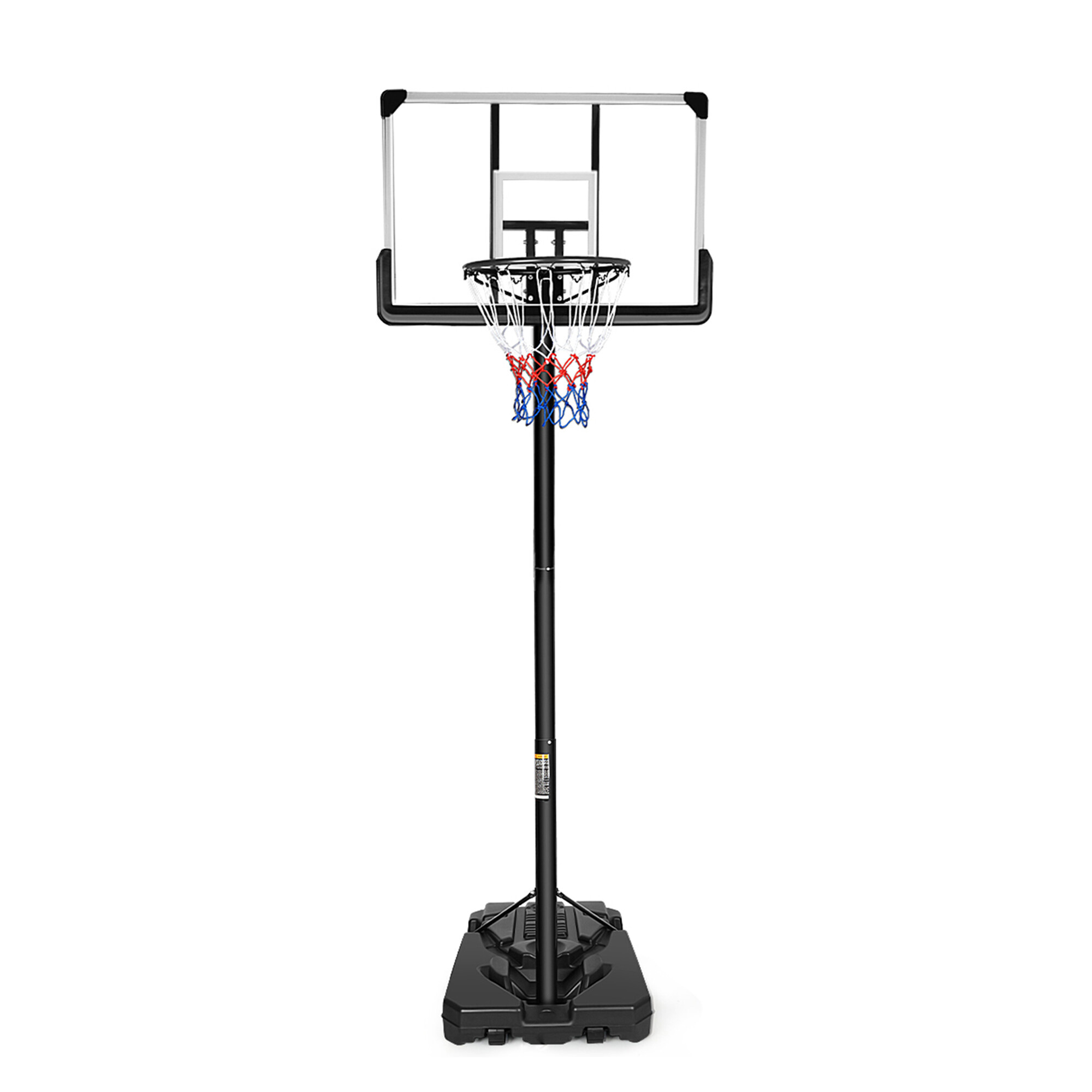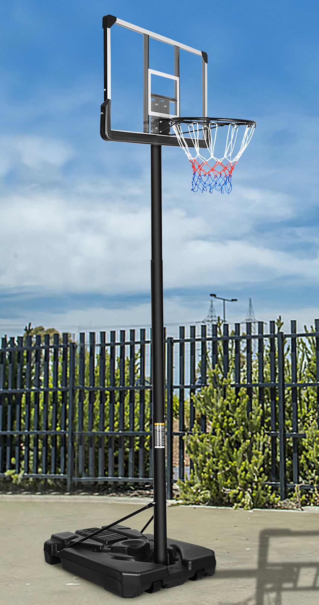 Mobilní basketbalový koš s nastavitelnou výškou, pevnou plastovou deskou a obroučkou se sítí.