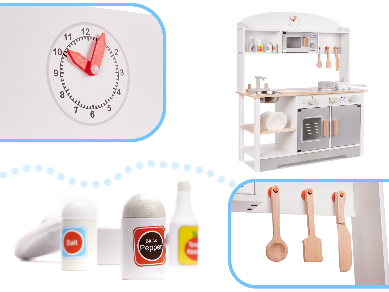 Všechny prvky (kromě dřezu) byly vyrobeny ze dřeva. Celá věc byla pečlivě obroušena a natřena netoxickou barvou - to vše pro bezpečnost vašeho děťátka.