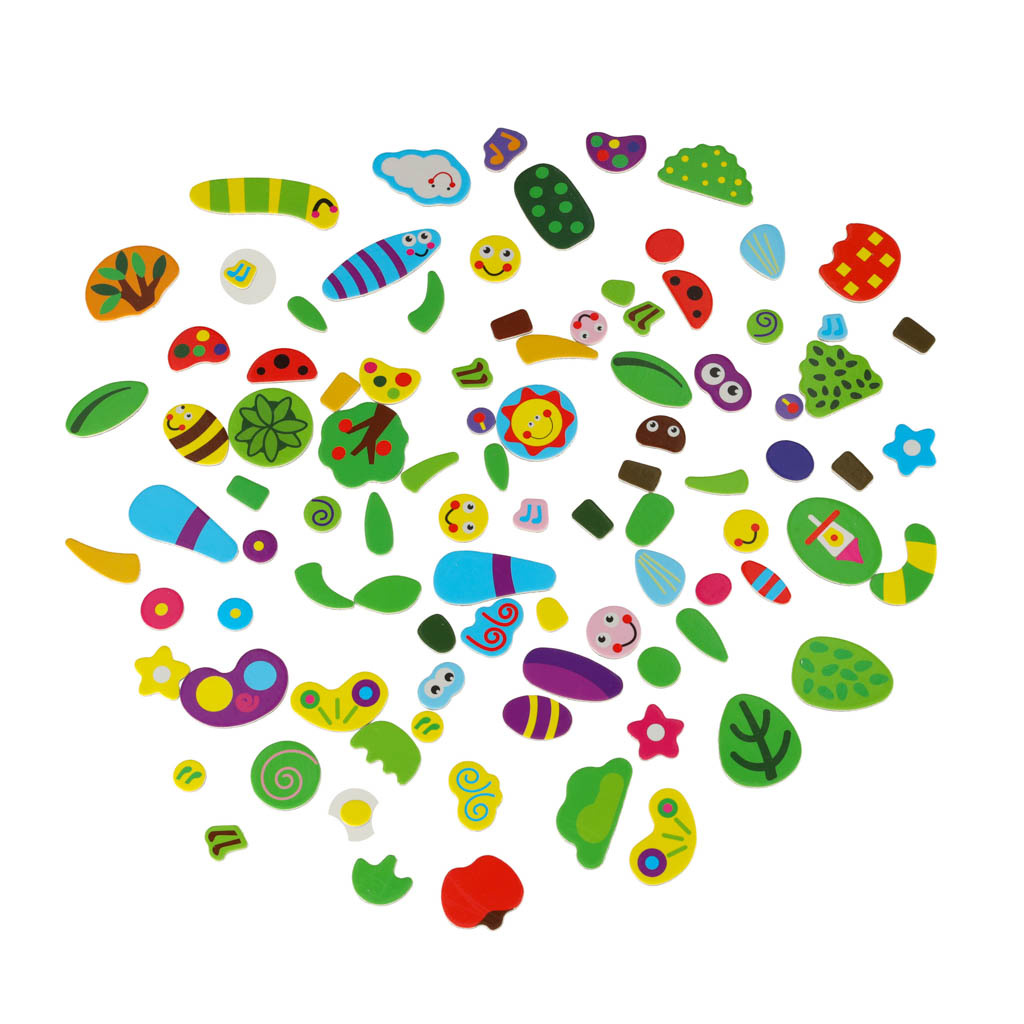 Oboustranná dřevěná deska s magnetickými skládačkami na uspořádání obrázků.
