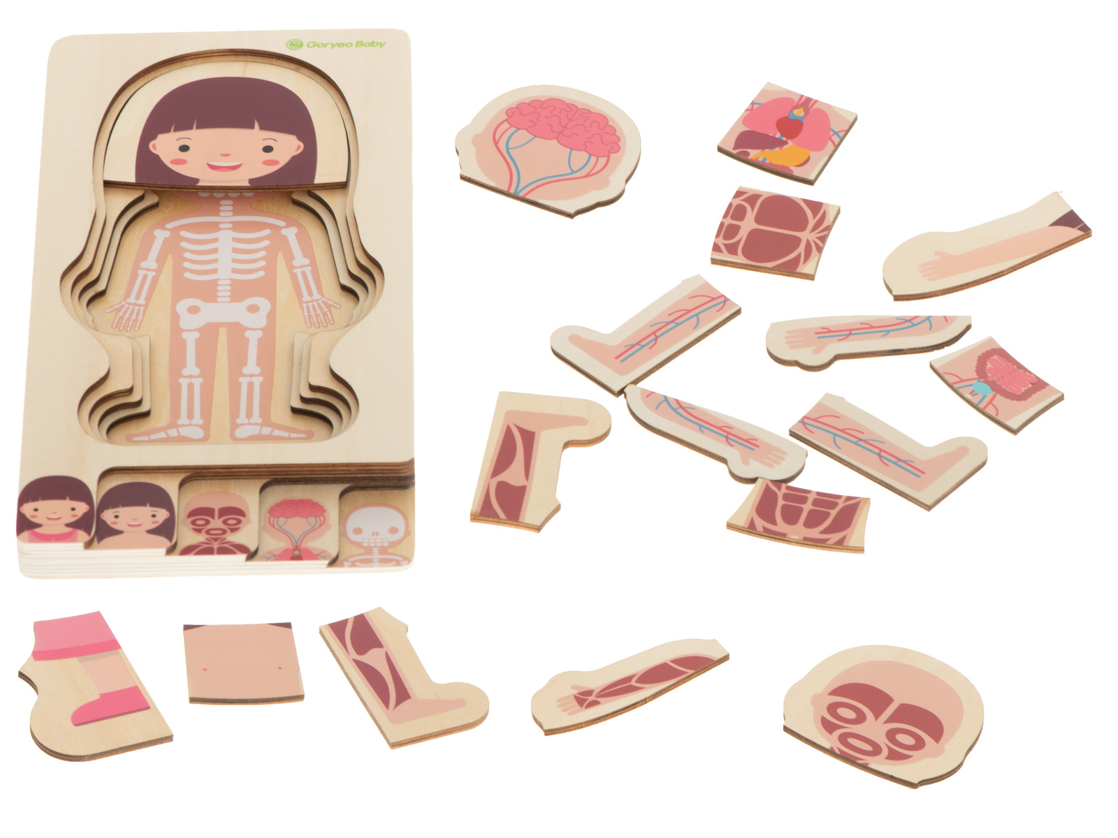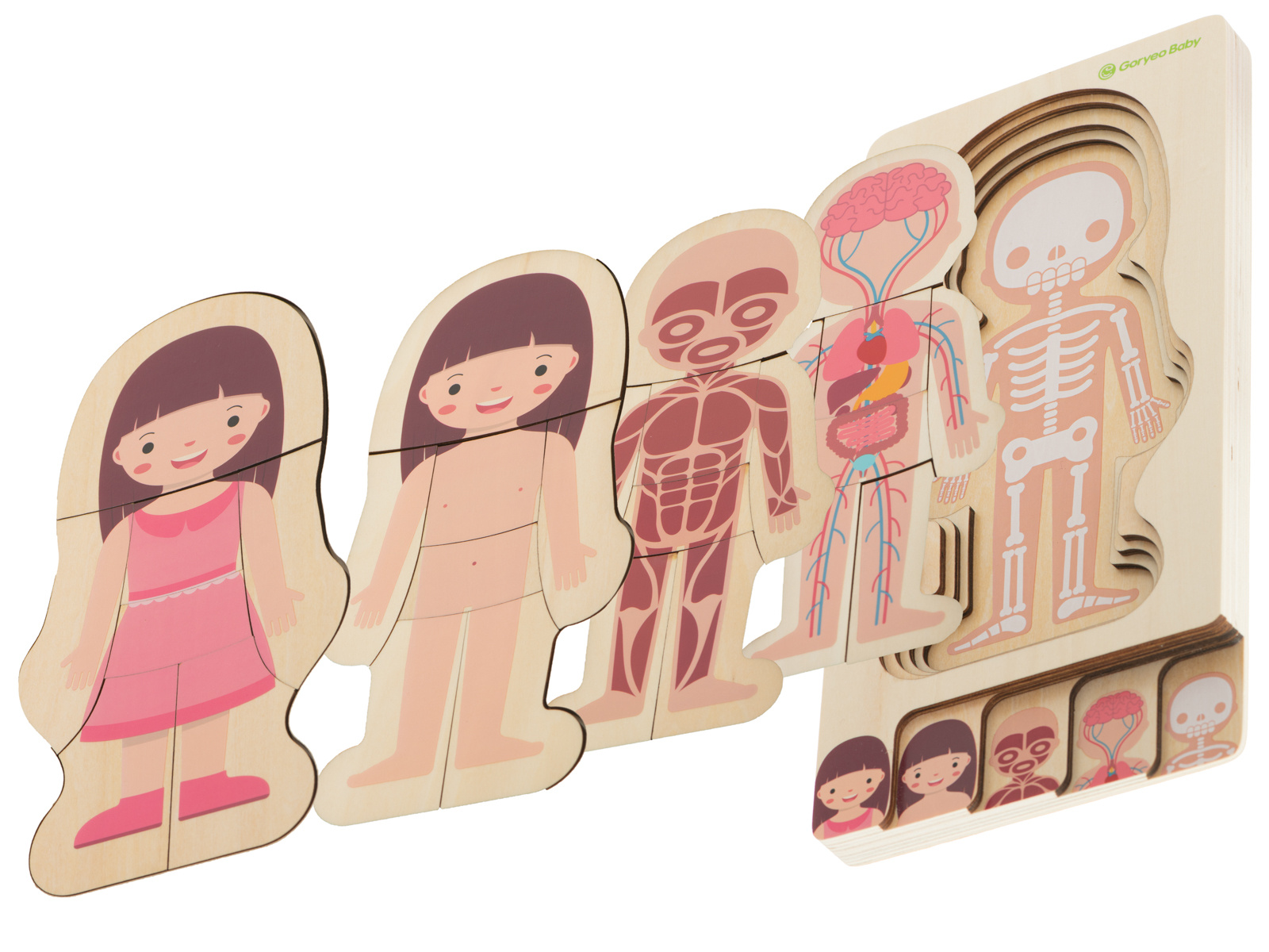 Kousky skládačky se překrývají ve vrstvách. Úkolem batole je uspořádat lidskou kostru, vnitřní orgány, svaly, tělo a nakonec oblečení do pořadí.