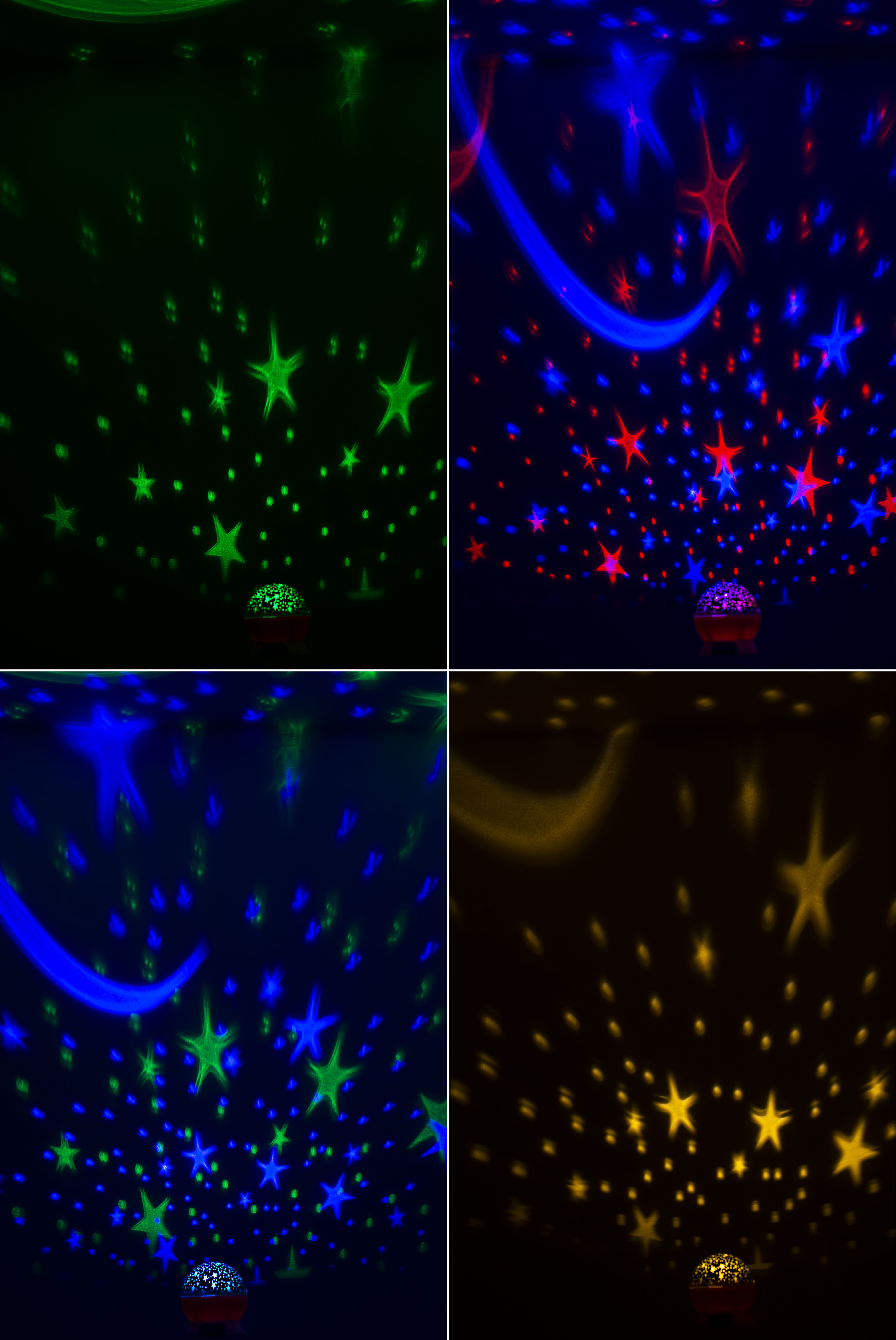 Lampa zobrazuje projekce hvězdné oblohy v různých barvách a režimech, - například plynulé změny barev nebo vypínání jednotlivých barev.