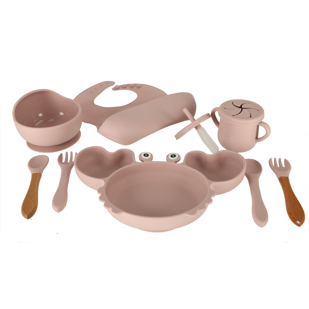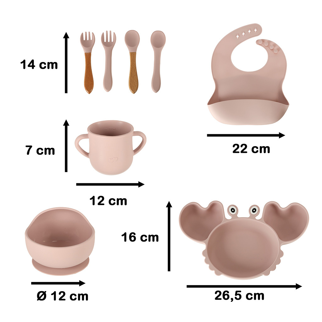Sada obsahuje veškeré potřebné příslušenství, jako je talíř ve tvaru kraba, miska s víčkem proti vysypání a rozlití jídla, hrneček se dvěma víčky (včetně jednoho s brčkem), příbory (některé s dřevěnými částmi) a bryndák. S touto sadou bude vaše dítě připraveno na každé jídlo!