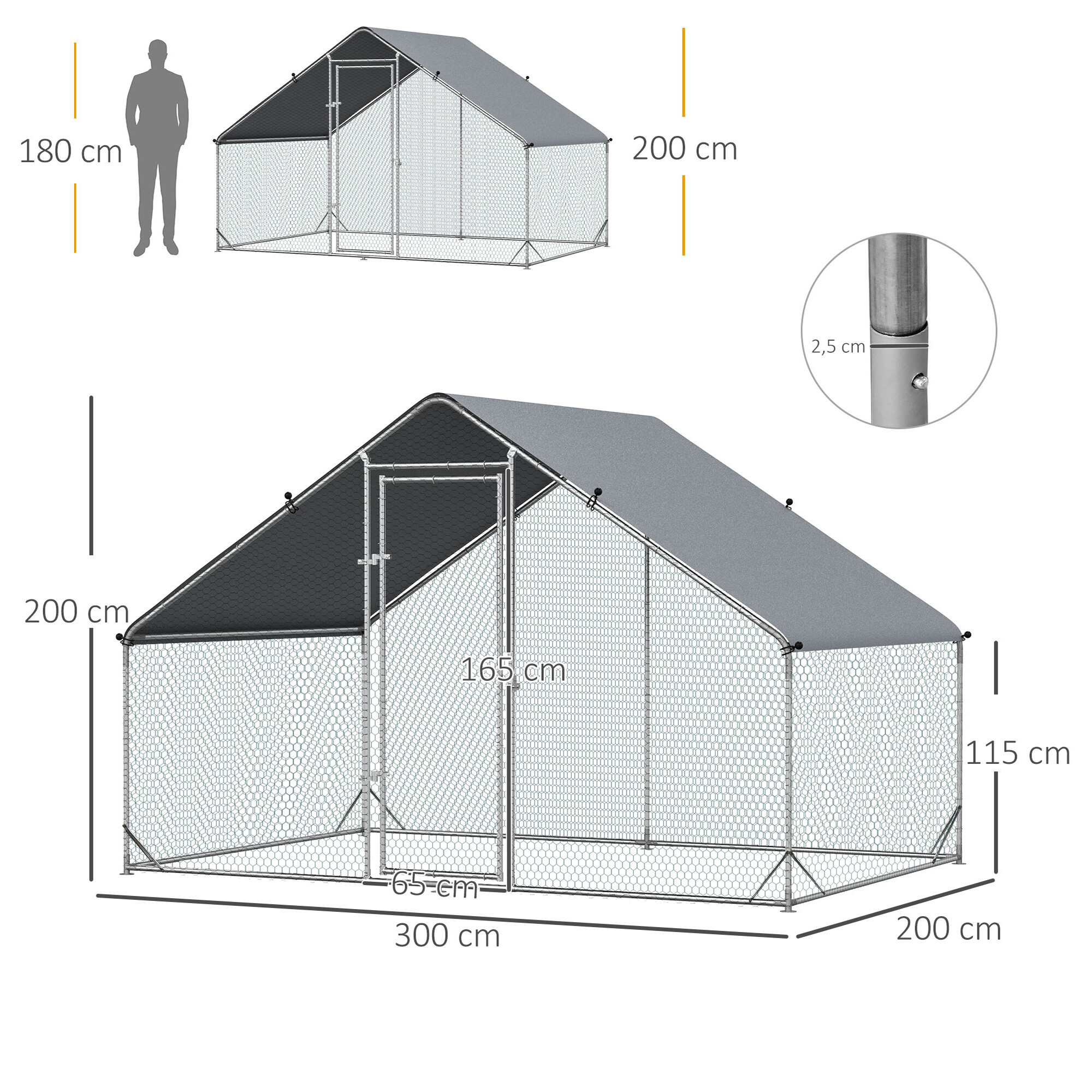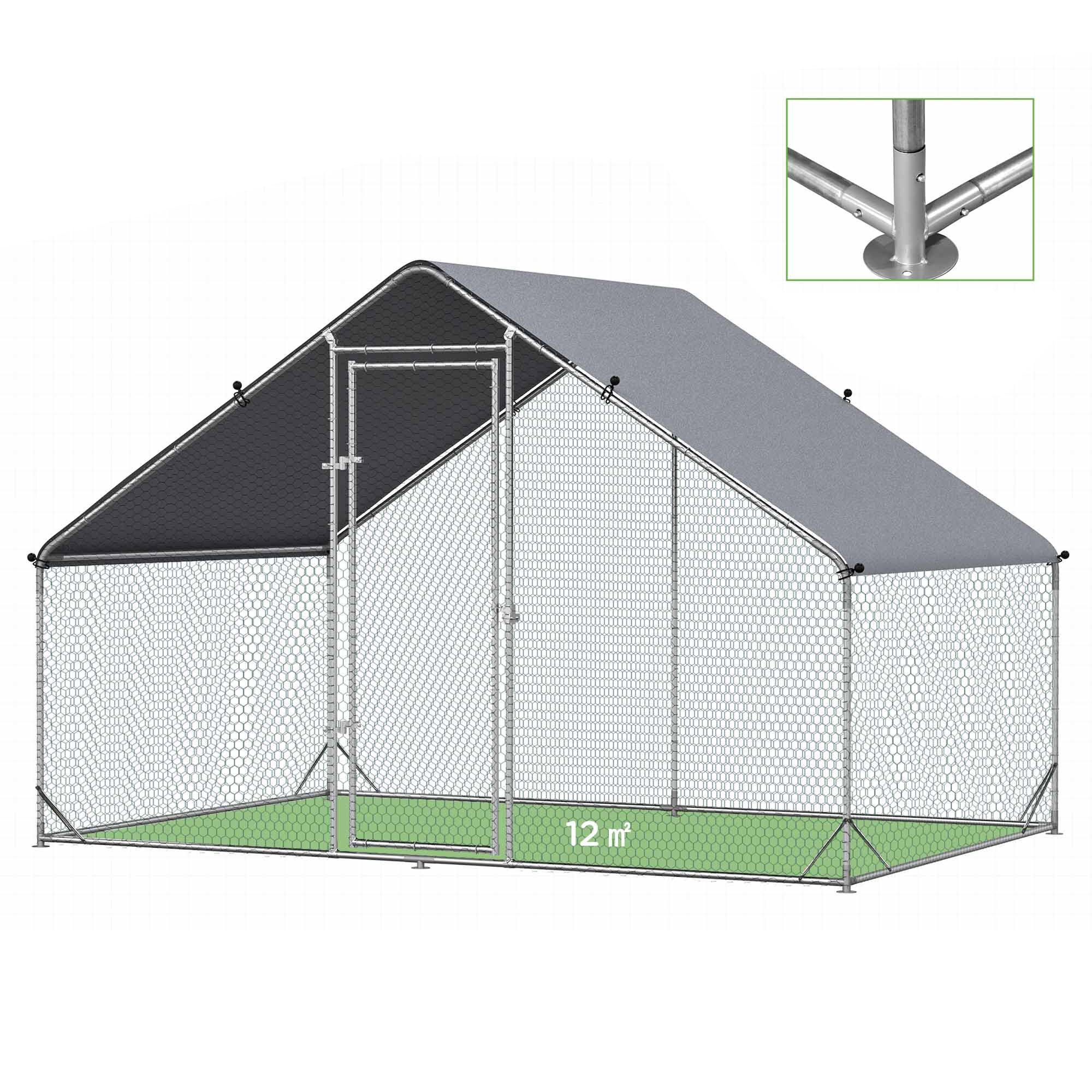 Klec vyrobena z pevné stříbrné pozinkované oceli, která dodá výběhu patřičnou stabilitu a zabrání nechtěným úrazům, v podobě útěků vaší drůbeže. Konstrukce je doplněna o pozinkované pletivo v zelené barvě a střechu, kterou tvoří šedá PVC plachta.