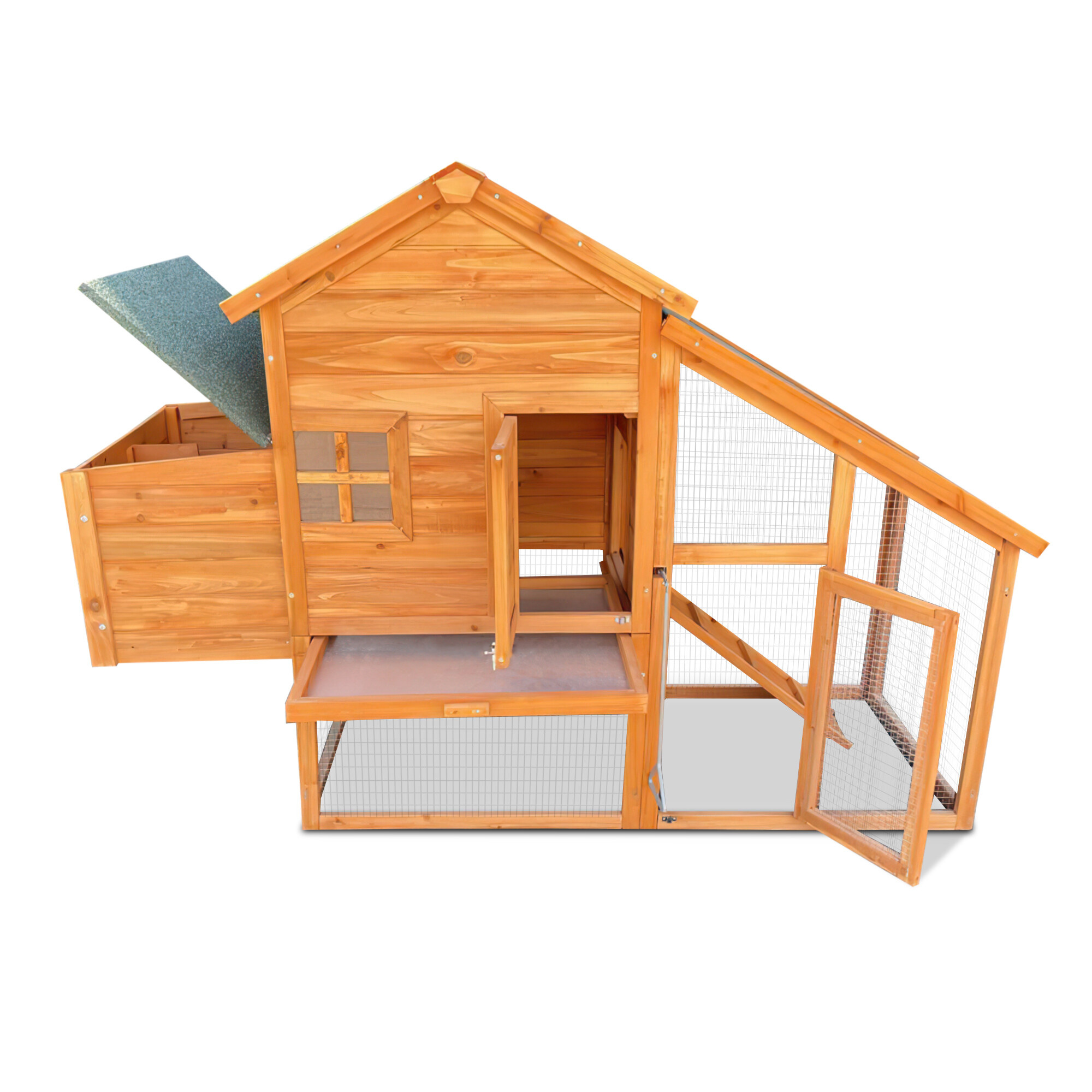 Výběh připojený k obytné části umožňuje slepicím volný pohyb. Střecha je osazena kvalitní šindelovou krytinou, která chrání slepice před deštěm a sněhem. Ze spodního do horního patra vede rampa, po níž mohou zvířata snadno vylézt nahoru. Dvířka lze jednoduše zavřít a zajistit zasouvacími západkami.