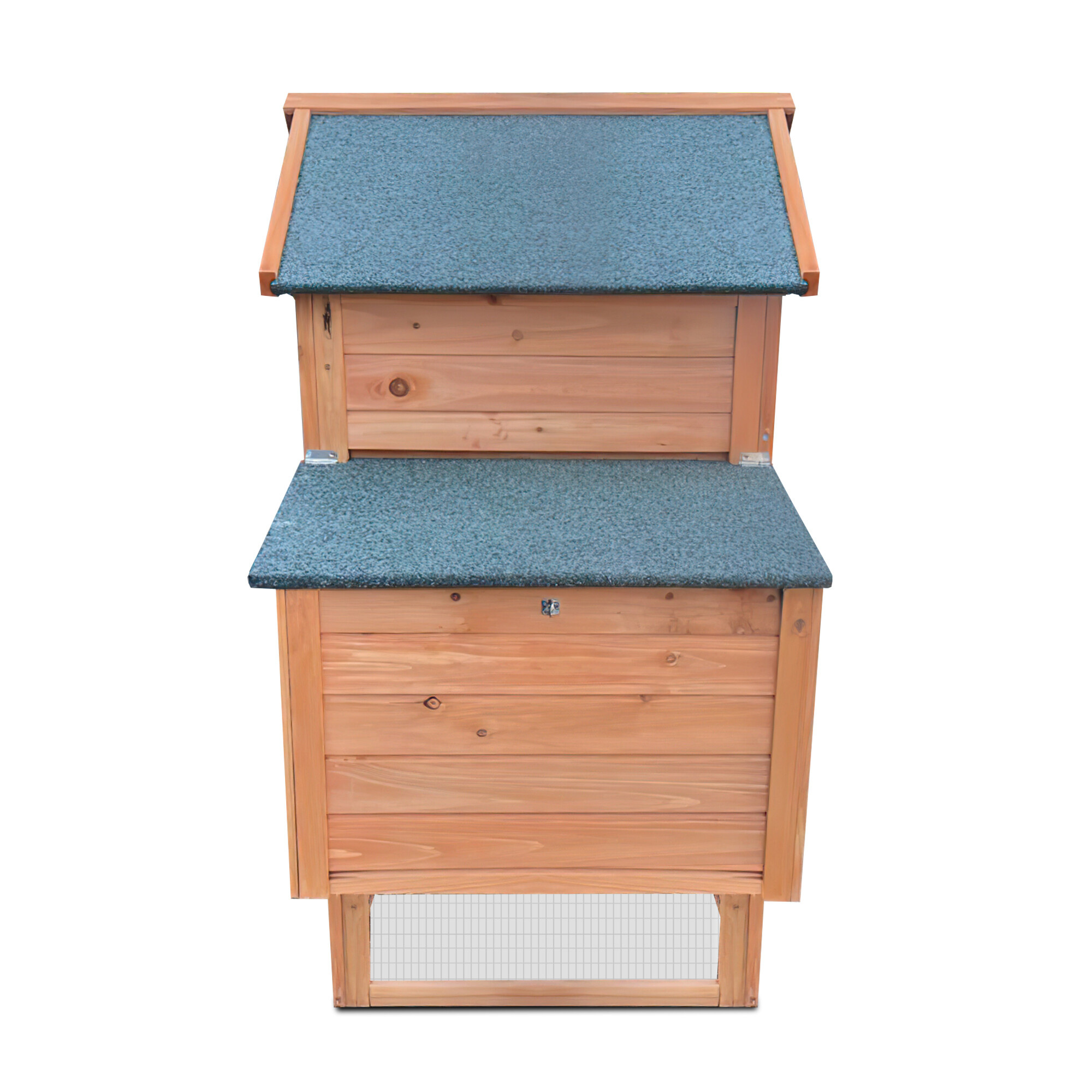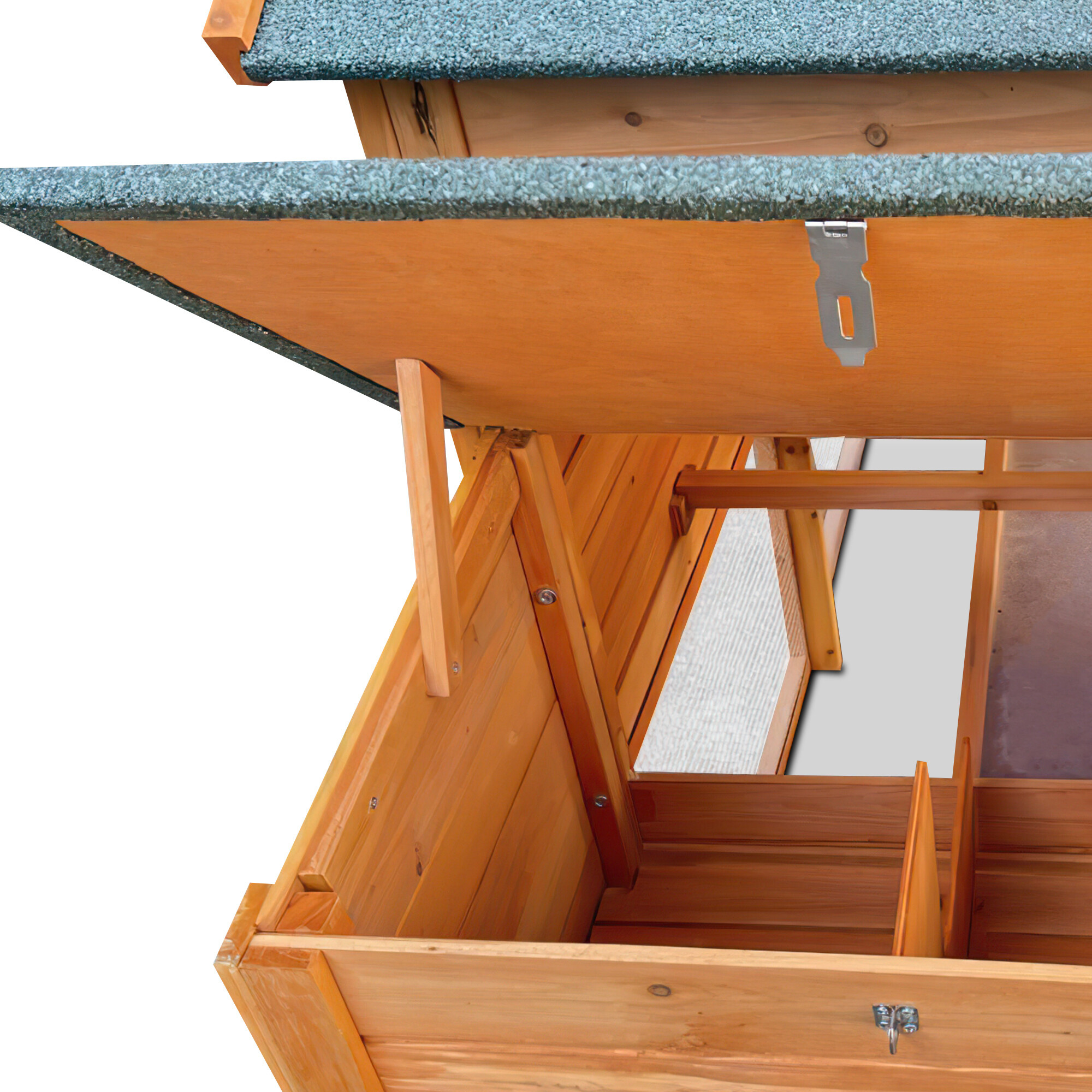 Jednou z hlavních výhod tohoto kurníku je sklápěcí střecha, která umožňuje snadný přístup k vejcím. Už žádné složité ohýbání a natahování jednoduše zvednete střechu a vejce jsou na dosah ruky.
