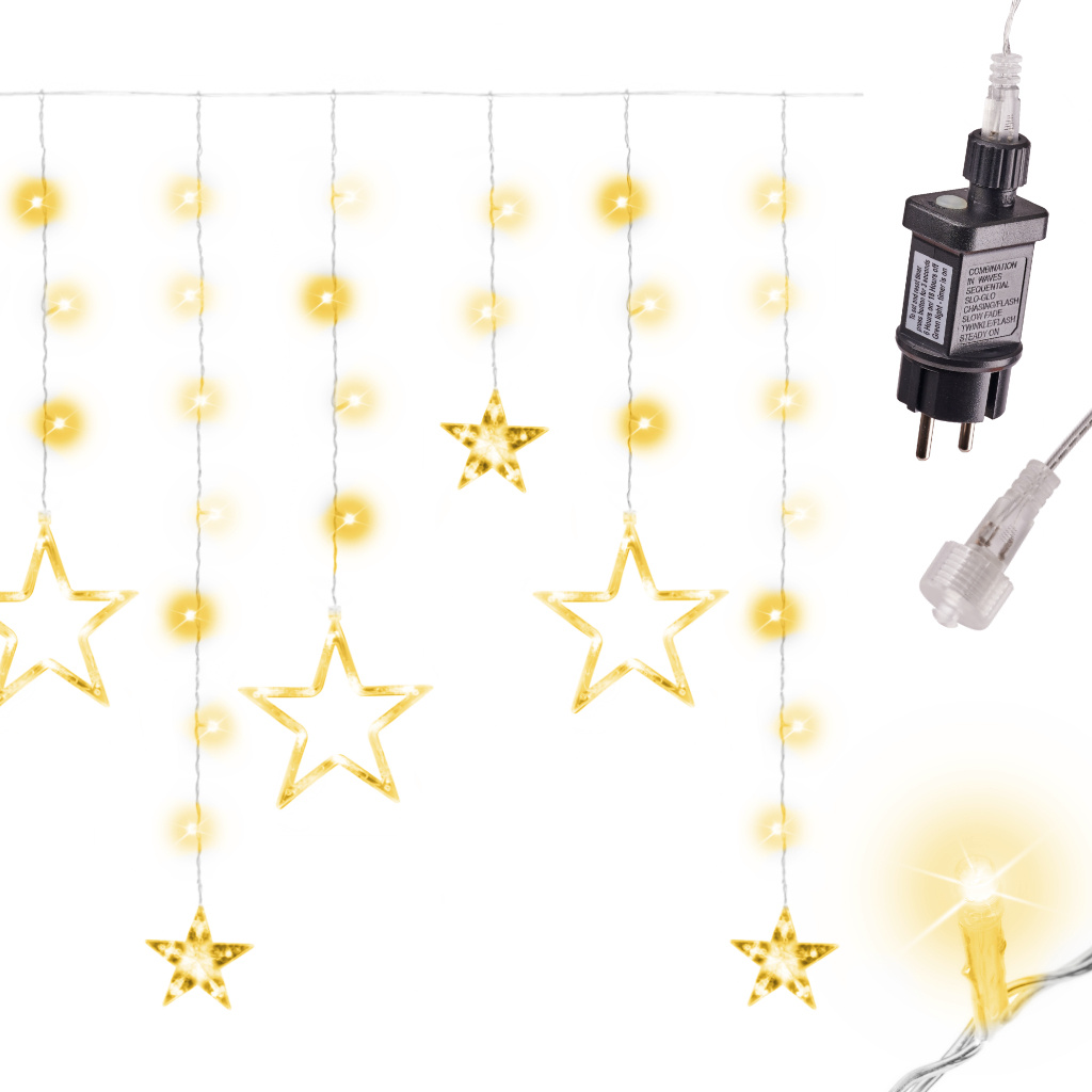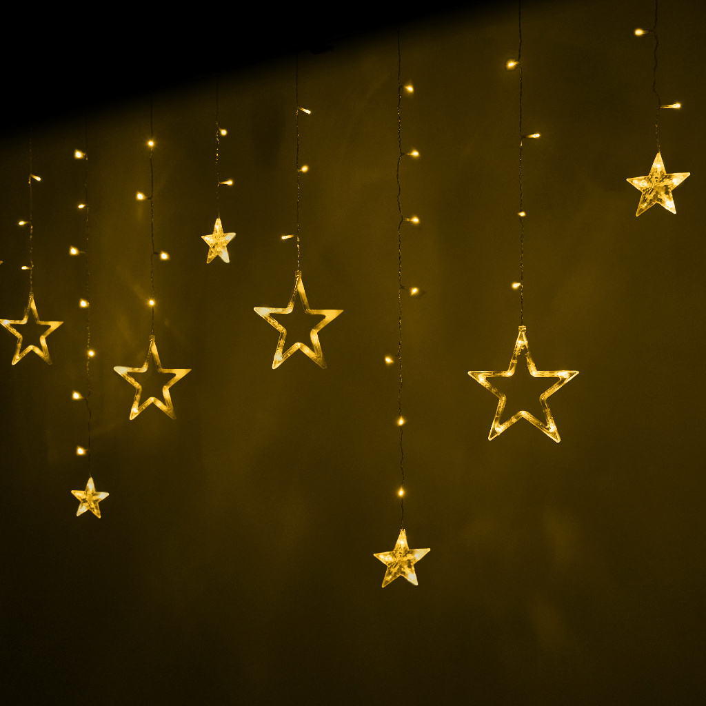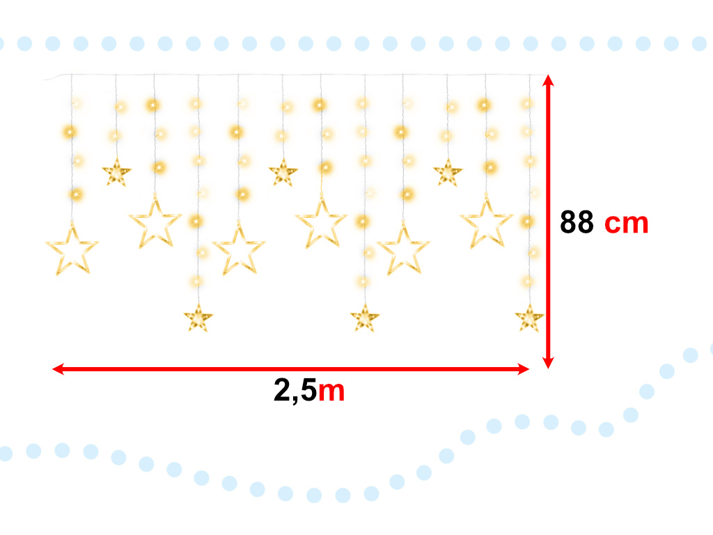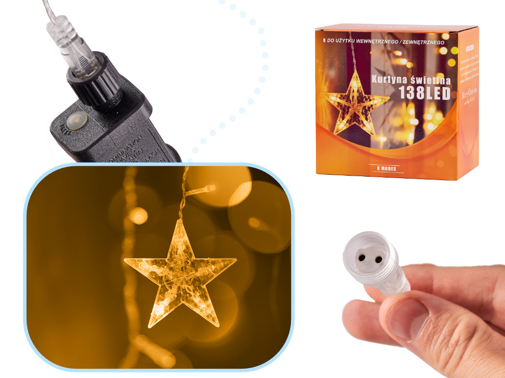 Díky teplé barvě, vnese do vašeho pokoje vánoční kouzlo. Skvěle hodí jako jedinečná vánoční dekorace, ale světýlka ve tvaru hvězdiček lze použít i v jiných ročních obdobích, zejména jako originální dekoraci. Nebo jako osvětlení dětského pokoje ve večerních hodinách. Světla jsou namontována na robustní silný kabel ,který zaručuje dlouhou životnost. Závěs můžete zavěsit na záclonovou tyč, takže se z obyčejných záclon stane slavnostní dekorace nebo dokonce nahradí záclony! Jediným kliknutím můžete výrazně změnit atmosféru v místnosti. Díky různým režimům osvětlení, můžete rychle přejít z útulného interiéru zaměřeného na odpočinek do veselého karnevalového večírku. Světla jsou napájena ze sítě, díky technologii LED nespotřebovávají světla mnoho energie. K osvětlen většího prostoru nepotřebujete více elektrických zásuvek .Dvě záclony můžete snadno spojit pomocí konektoru,můžete také propojit různé sady světel, pokud mají ploché zástrčky.