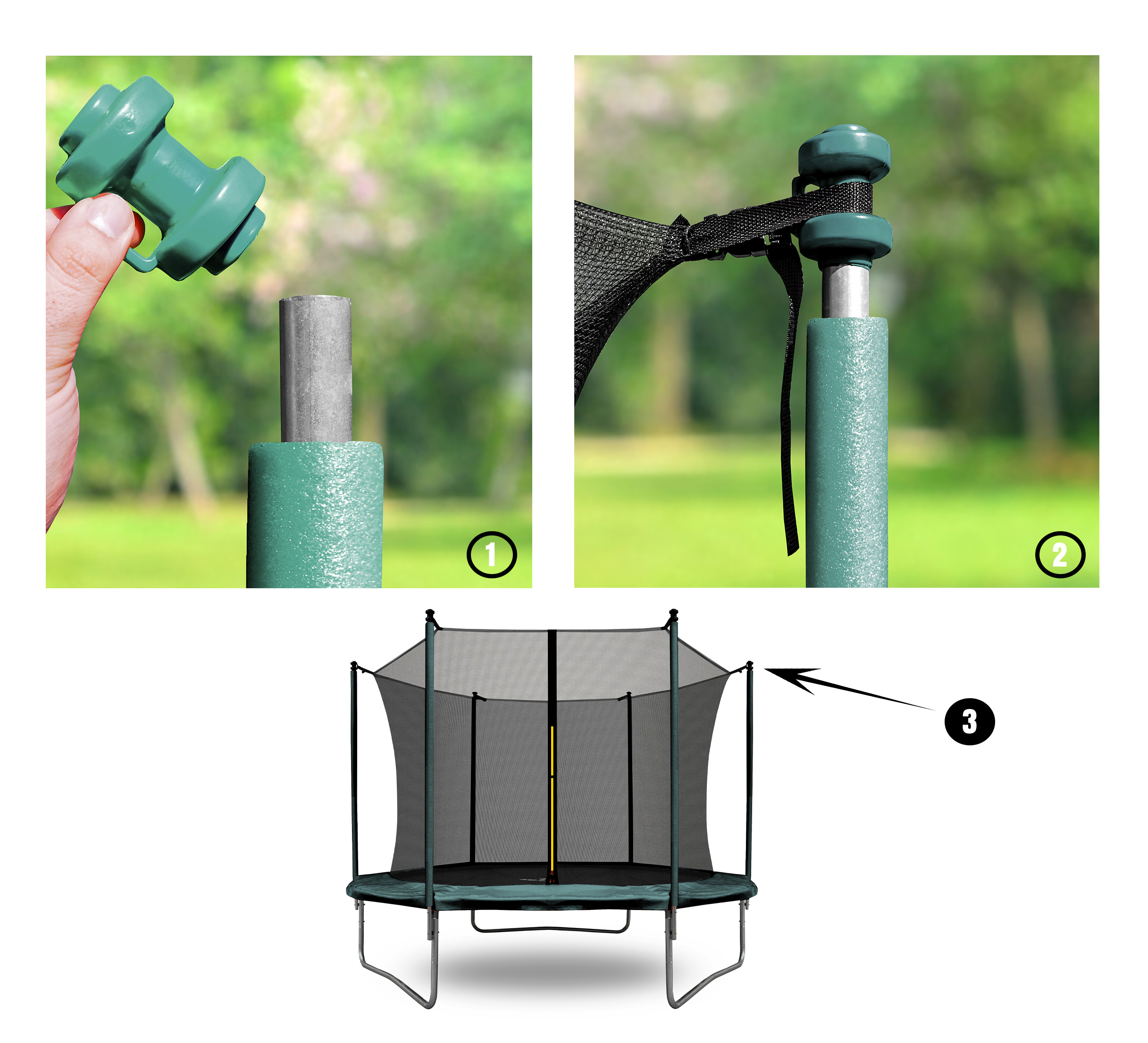 Klobouček se nasazuje na horní ochrannou tyč sítě trampolíny a jejím hlavním úkolem je zabránit zranění o ostrou hranu.