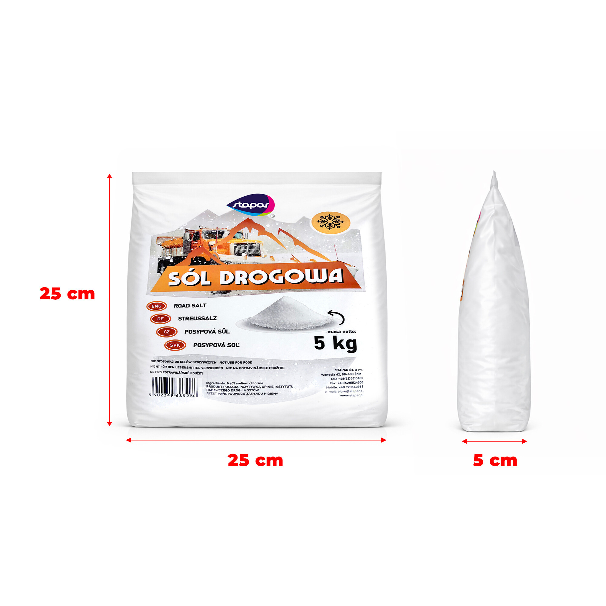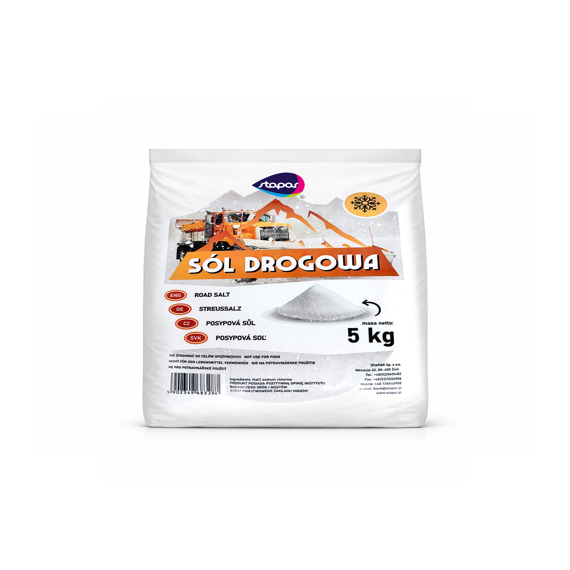 Tato zimní posypová sůl 5 kg je určena výhradně k technickému použití. Není vhodná pro potravinářské ani krmné účely.