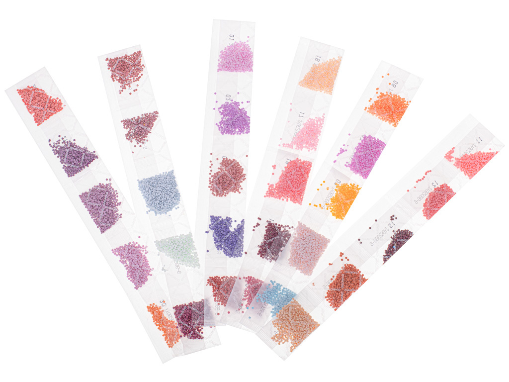 Nasypte vybranou barvu korálků do malého zásobníku a zkontrolujte značení na sáčku. Vezměte aplikátor a ponořte jeho špičku do suchého lepidla. Na suchý aplikátor lepidla nalepte kosočtverec a přiložte jej na příslušné místo plátna. Je důležité nejdříve dokončit skládání jedné barvy a teprve poté přejít k další, jinak by se korálky mohly promíchat. Nyní je můžete zarámovat a pověsit na zeď.