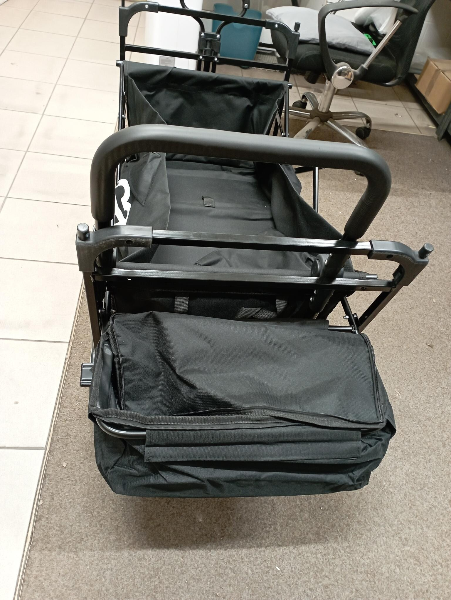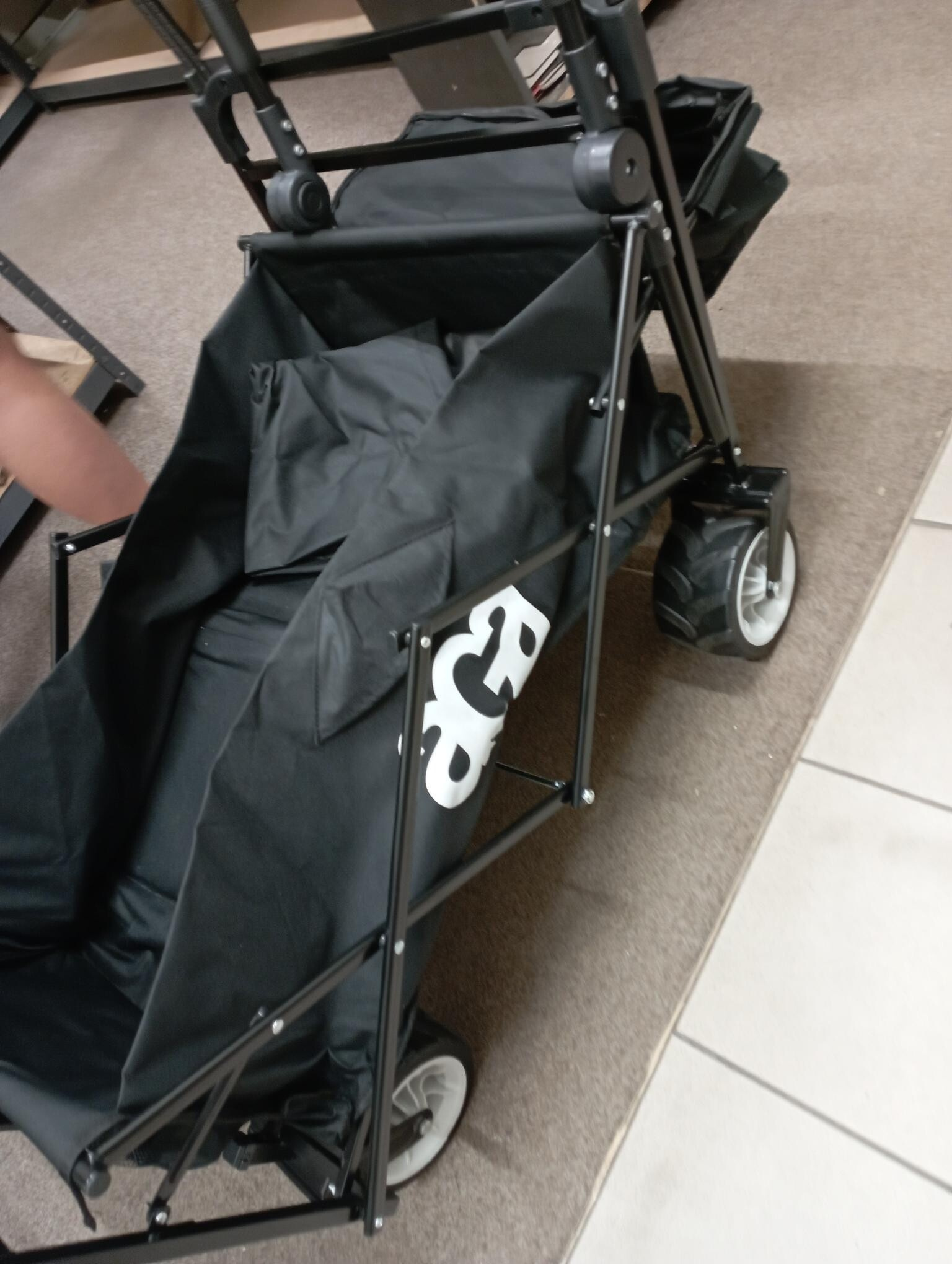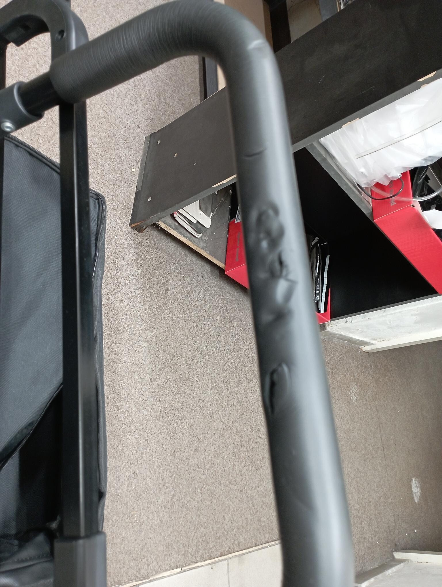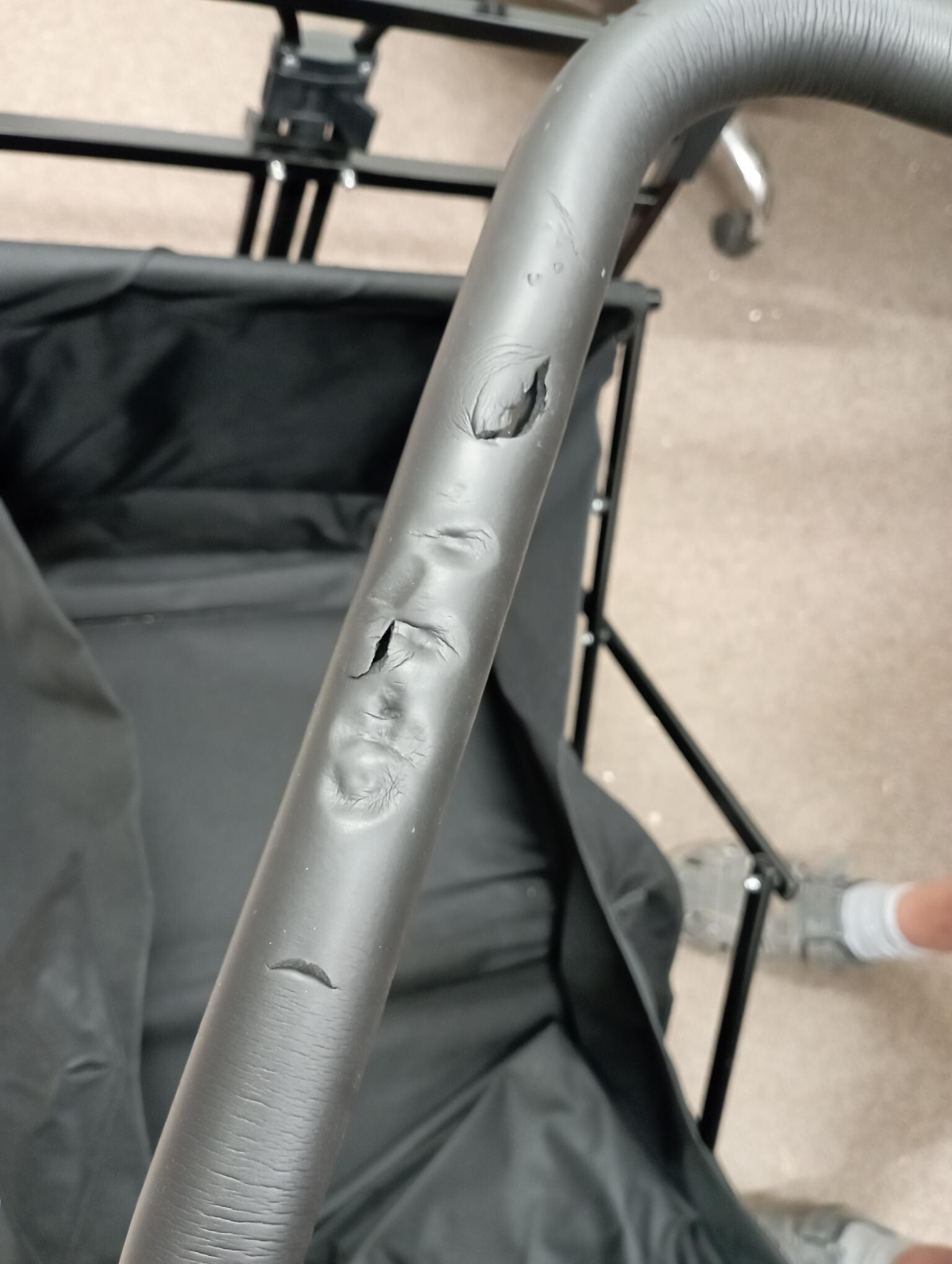 Vozík byl pouze rozbalený a je kompletní a plně funkční. Pěnové madlo je poškozené, což je čistě kosmetická vada, která nijak neomezuje stabilitu ani používání vozíku.