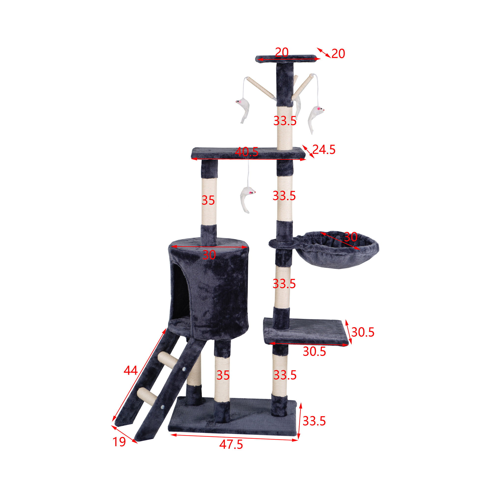 - Škrabadlo obsahuje: 1 domeček pro možnost úkrytu, 4 odpočívadla, žebřík, 4 hrací myšky připevněny na elastických provazech a sloupky částečně potažené sisalem