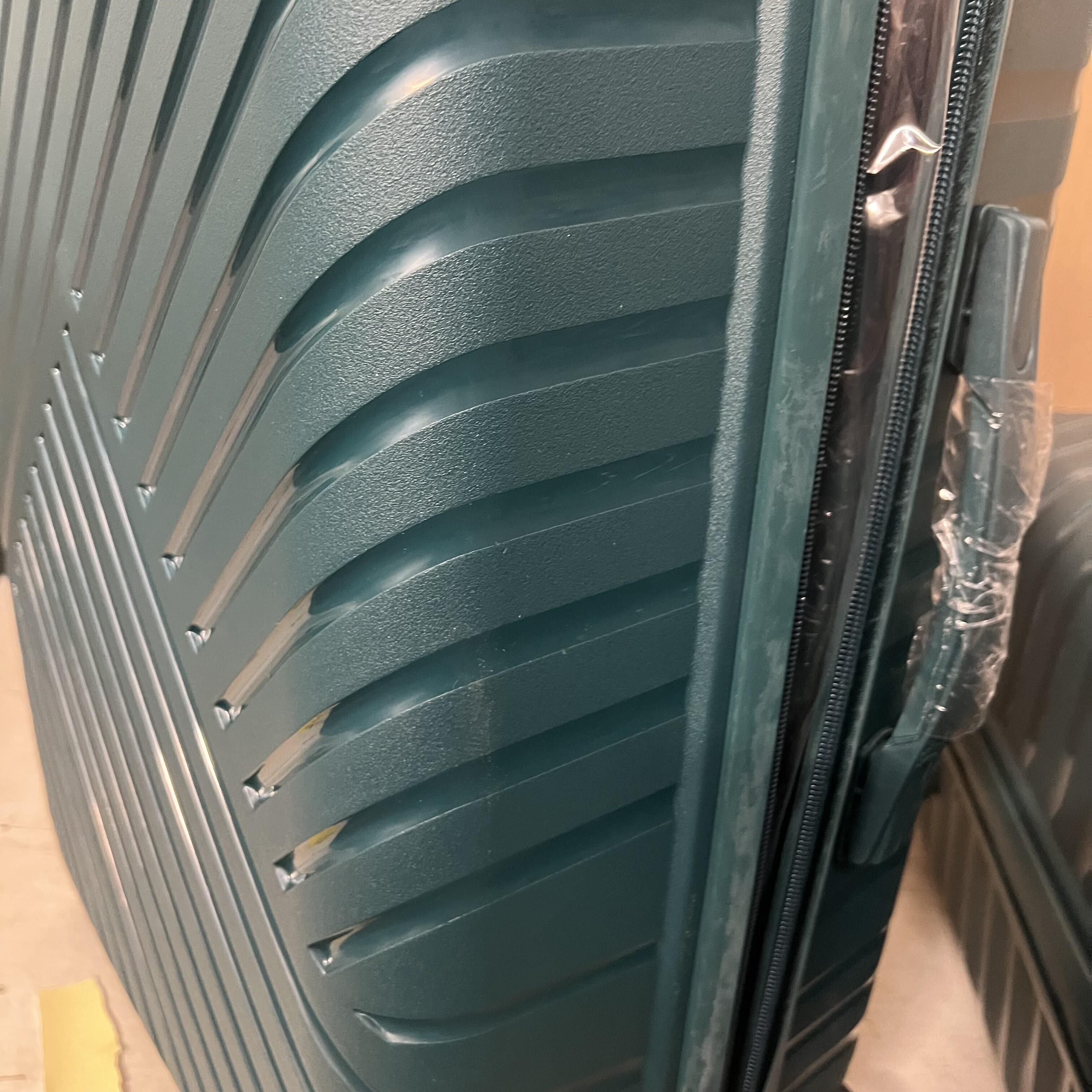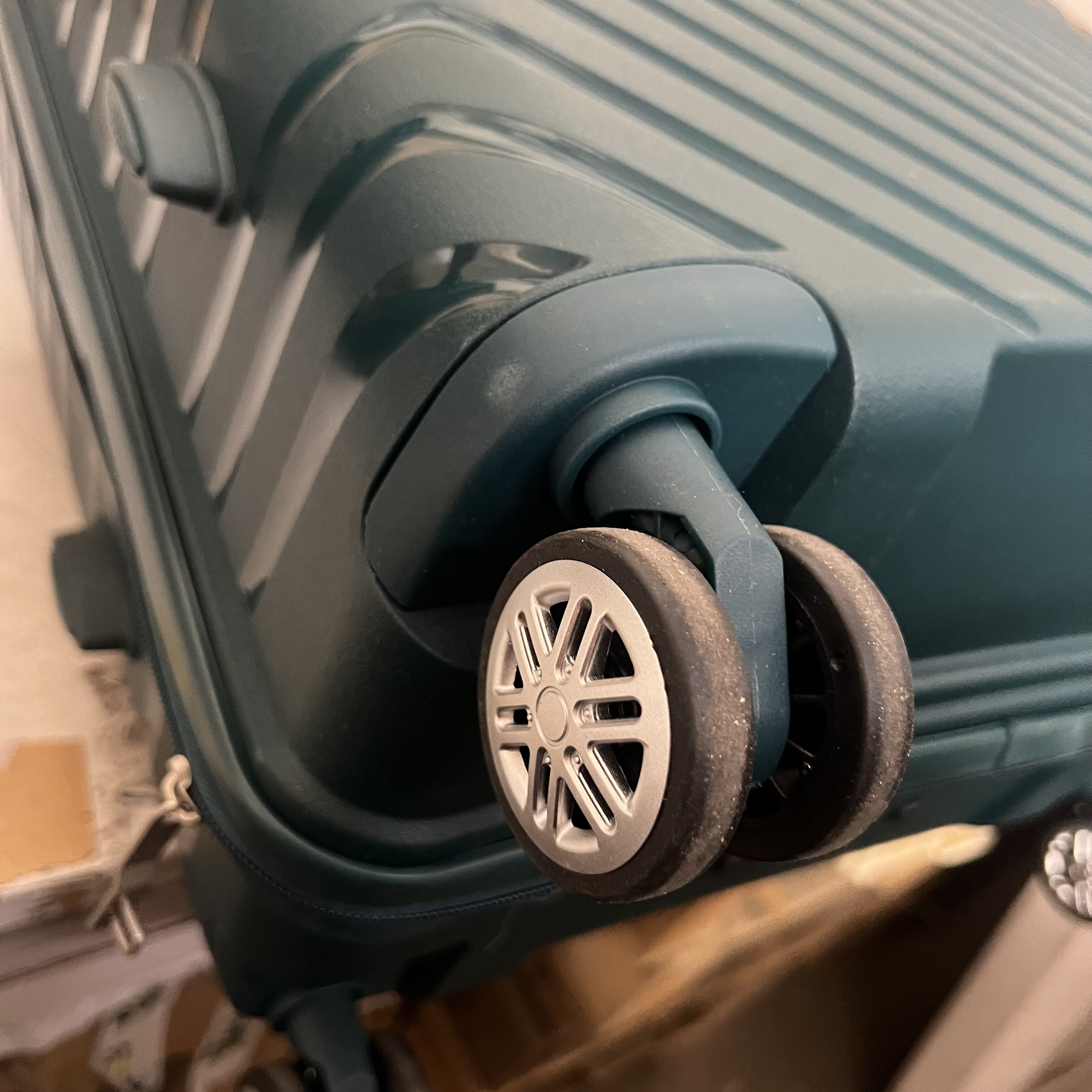 Kolečka jsou mírně znečištěná a povrch kufru má lehké škrábance.