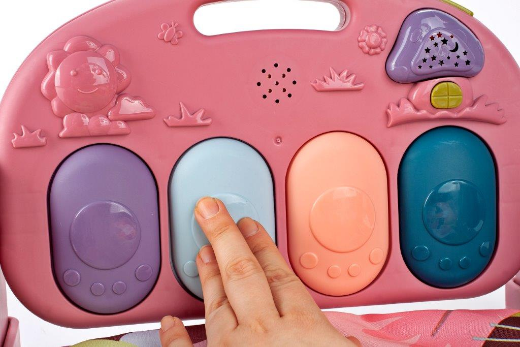 každá klávesa se po stisknutí rozsvítí. 3 zvukové režimy: zvuky řady Do-Re-Mi-Fa, krátké zvuky, např. dětský smích, každá klávesa je jiná delší melodie