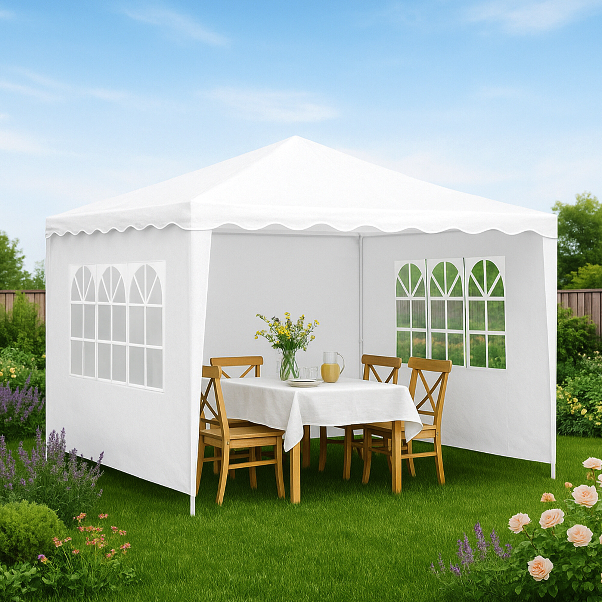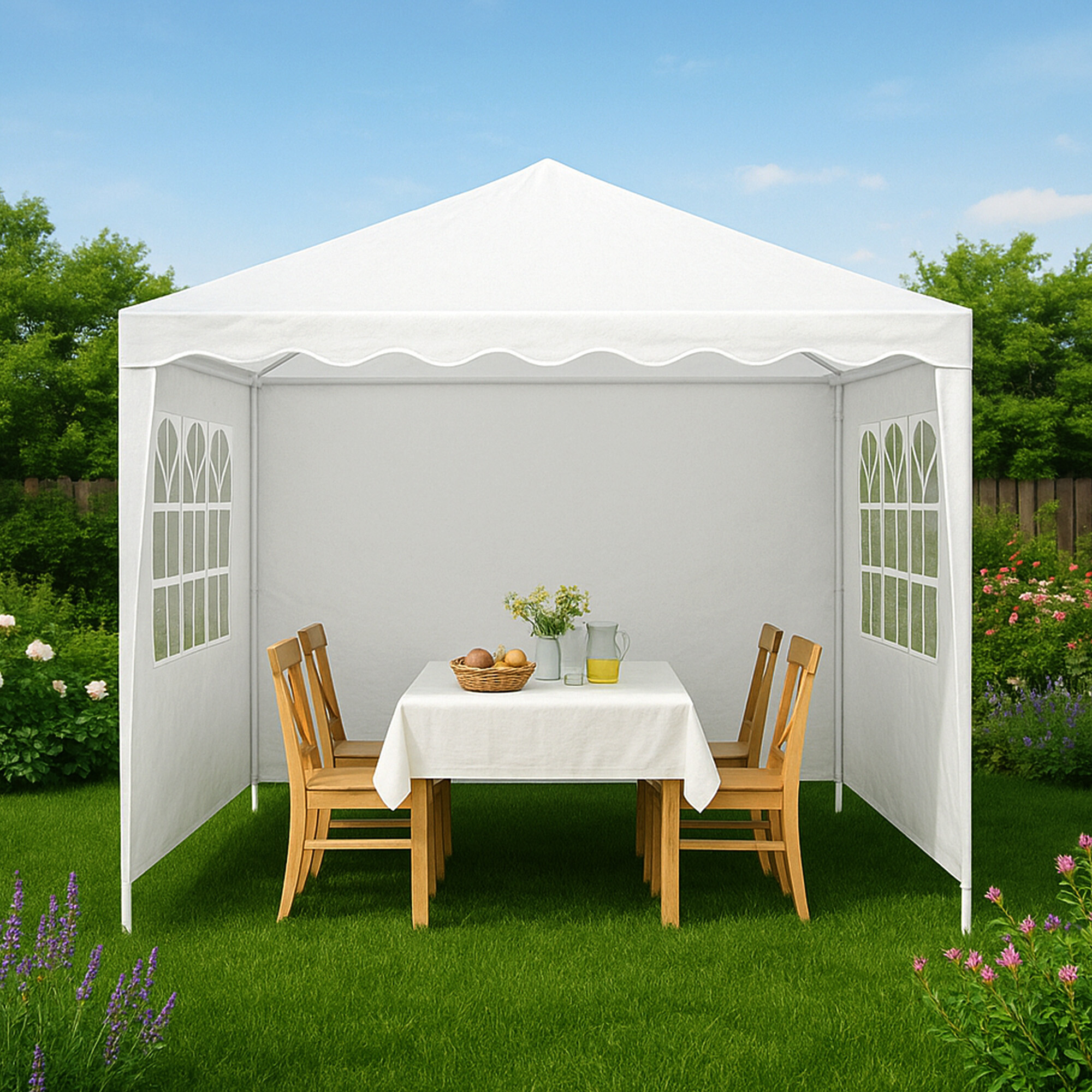 Altán je vybaven třemi bočními stěnami, které se připevní na konstrukci suchým zipem. Dvě bočnice mají průhledná okénka tato okénka umožňují dostatek přirozeného světla uvnitř altánu.