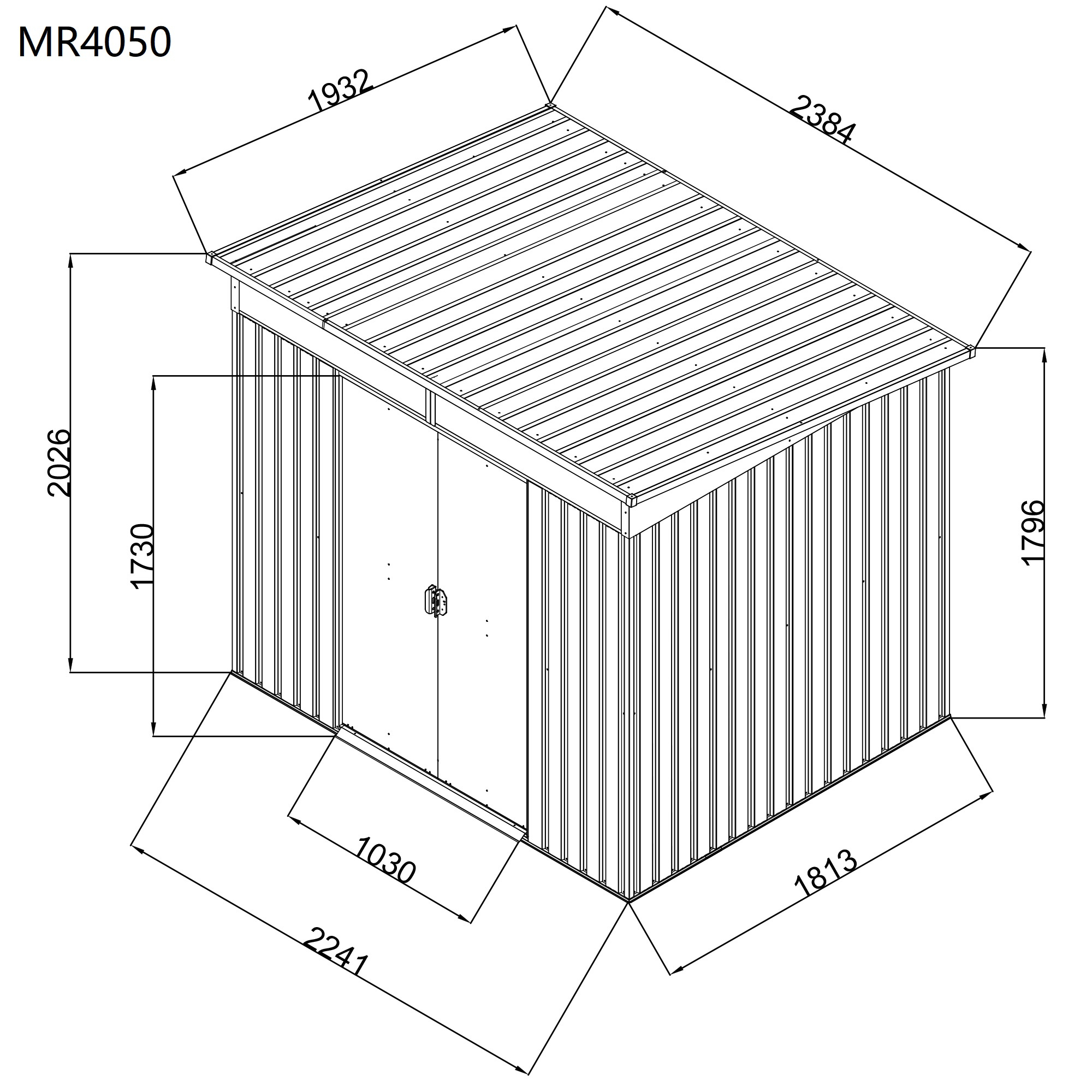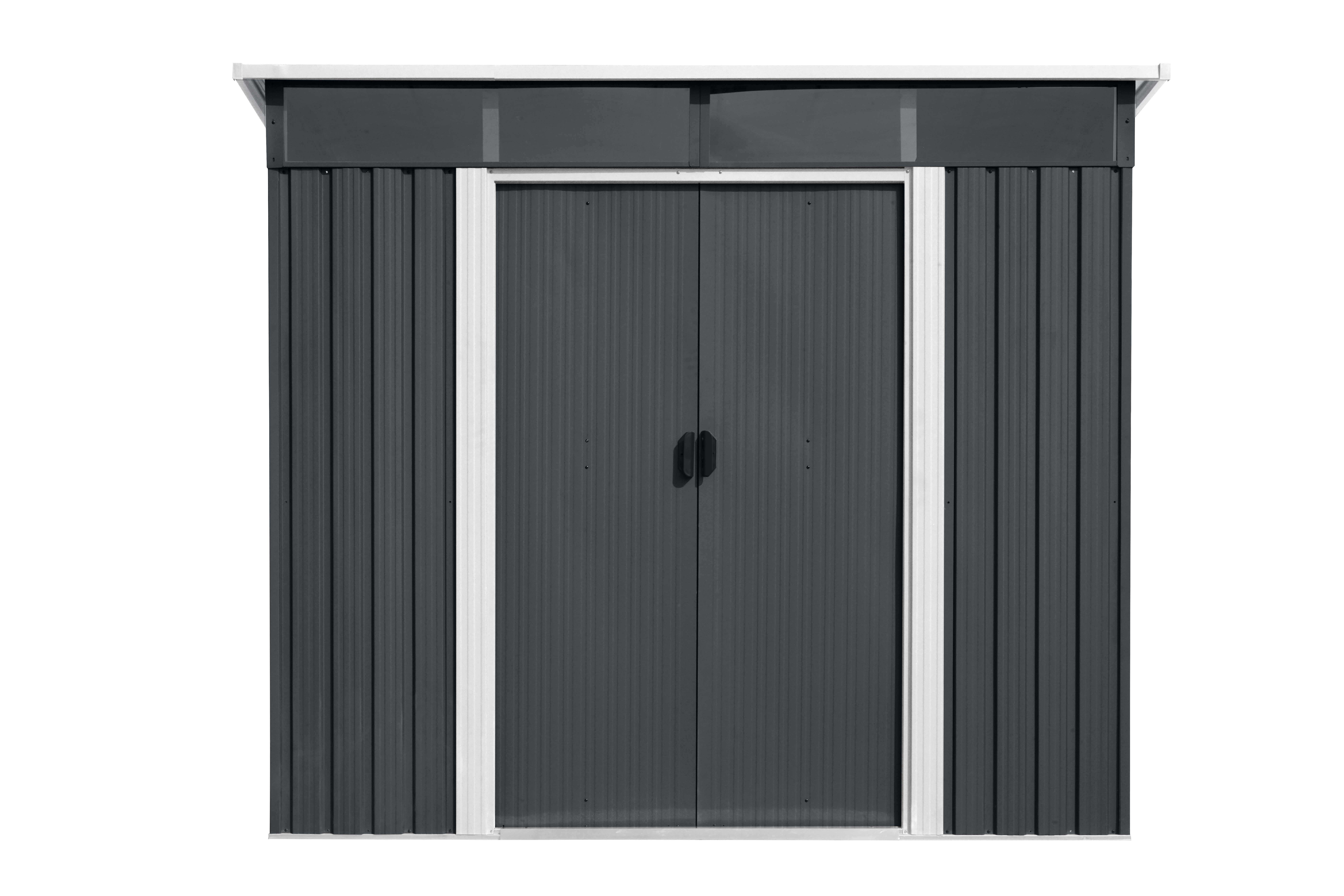 Zahradní domek má dvojité posuvné dveře o šířce 103 cm a výšce 173 cm. Součástí jsou i dveřní úchyty, díky kterým lze domek uzamknout běžným visacím zámkem.