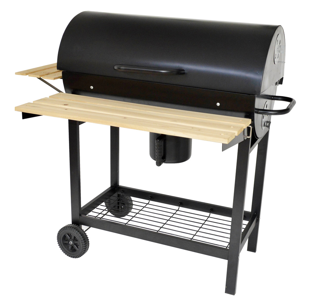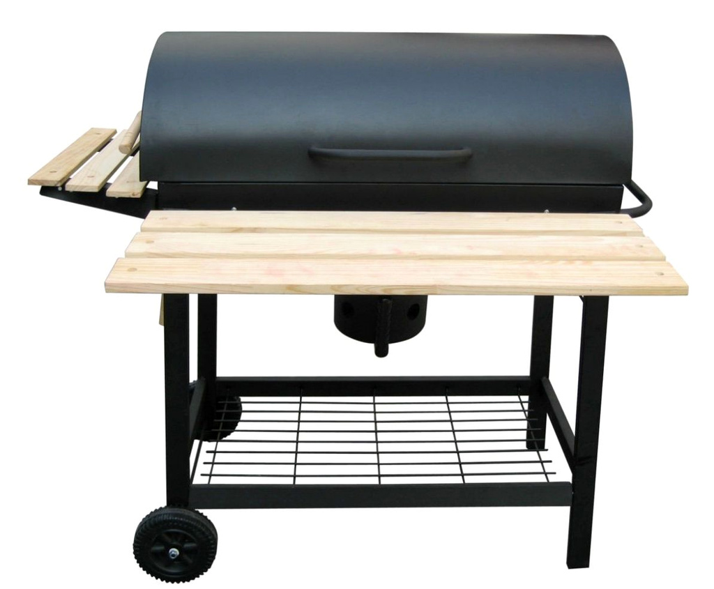 Hobby zahradní gril s poklopem na dřevěné uhlí nebo brikety, vyroben z plechu opatřeným žáruvzdorným nátěrem.