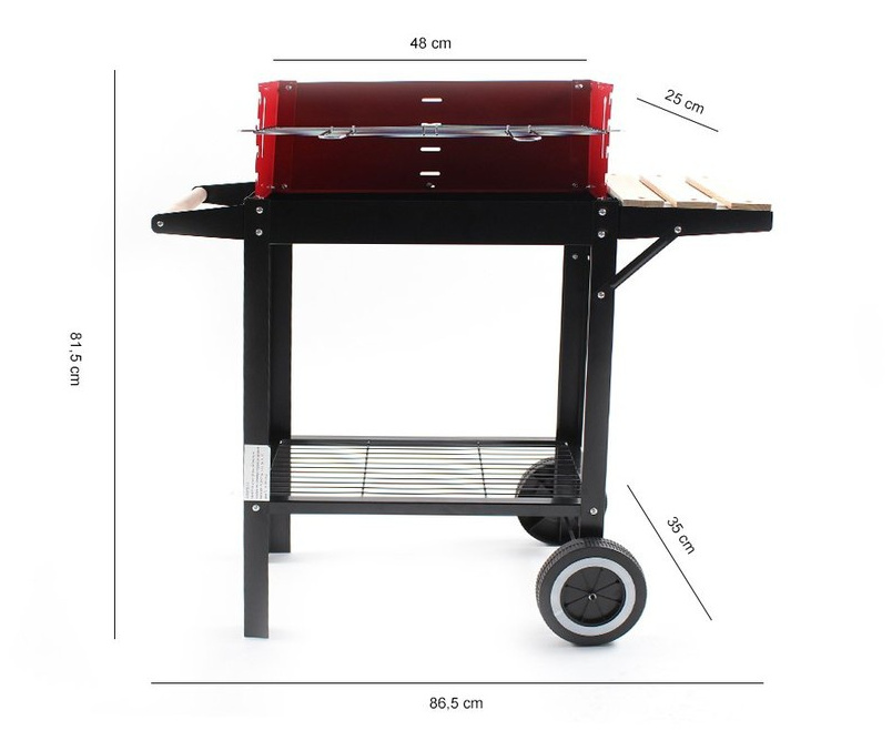Aga zahradní gril na dřevěné uhlí vybaven obdélníkovým grilovacím roštem, spodní policí a dvěma transportními kolečky.