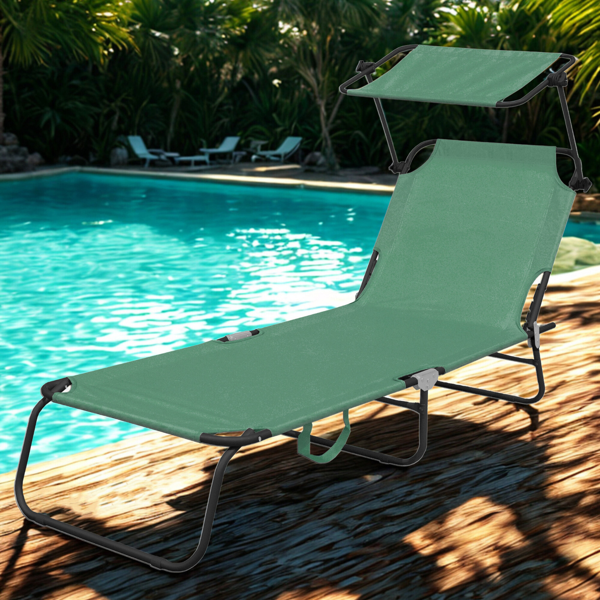 Skládací zahradní lehátko se zpevněnou ocelovou konstrukcí, v moderním designu, vhodné pro zahrady, na kempování či pláže.