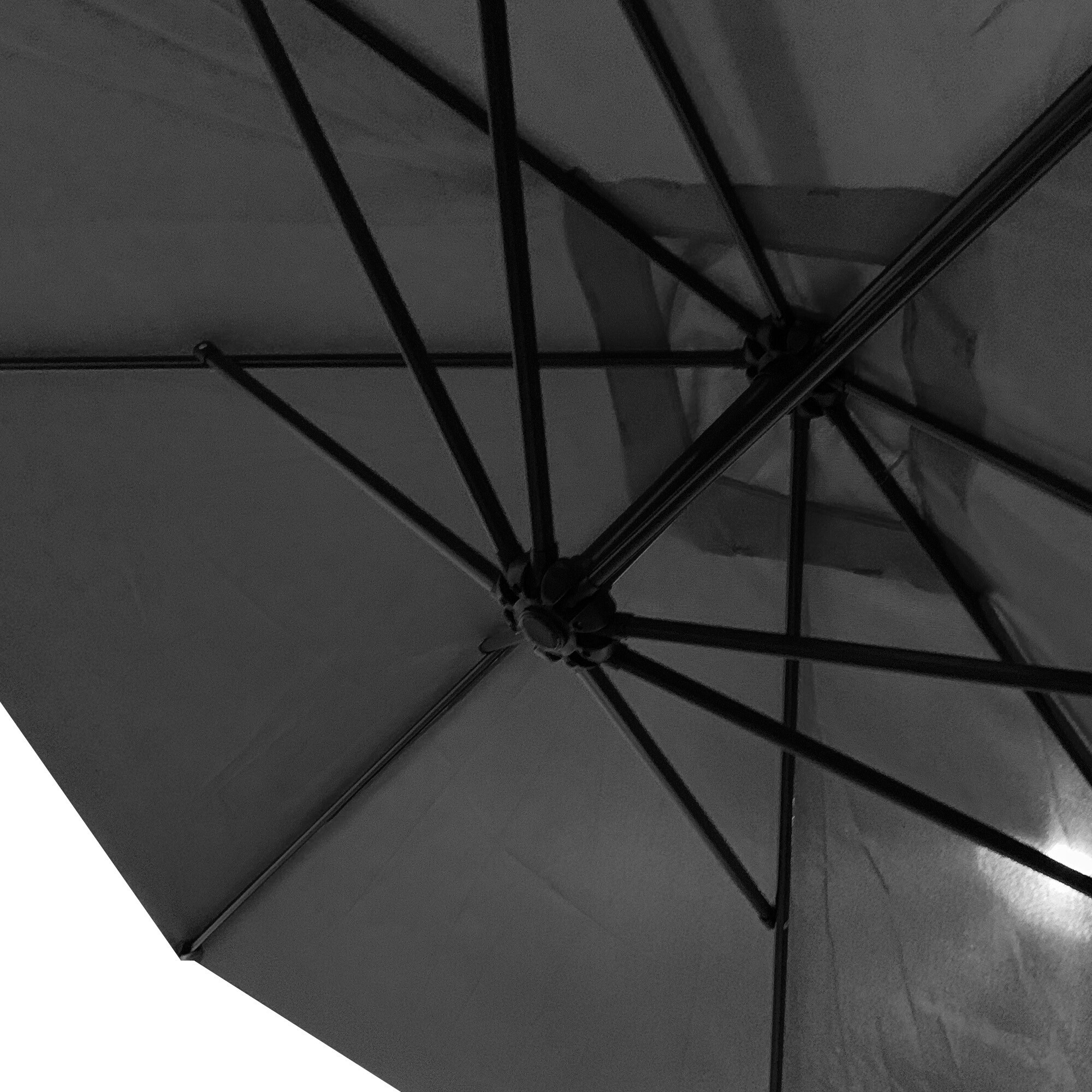 Zahradní slunečník vyrobený z odolného polyesteru, jehož noha je umístěna mimo stíněnou plochu.