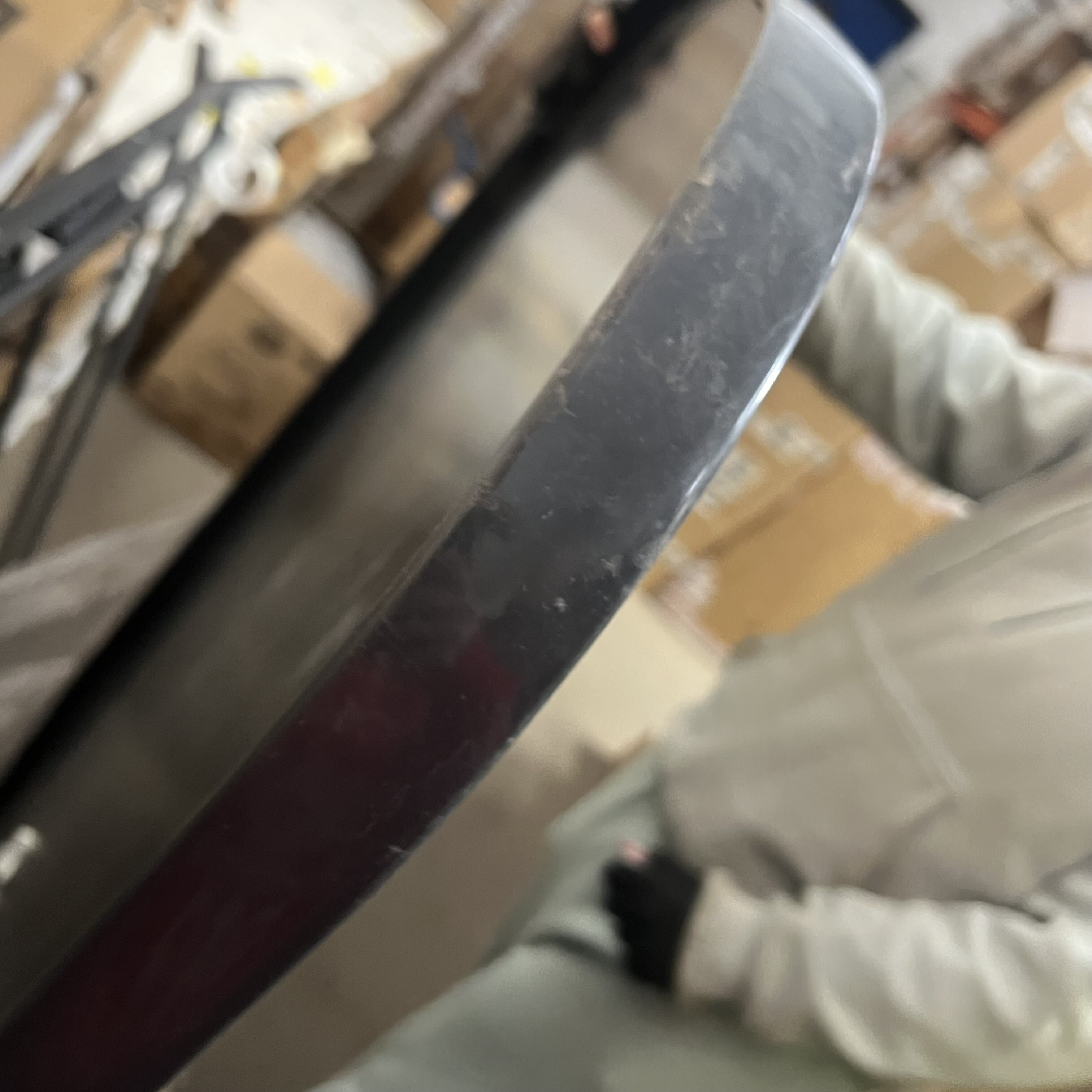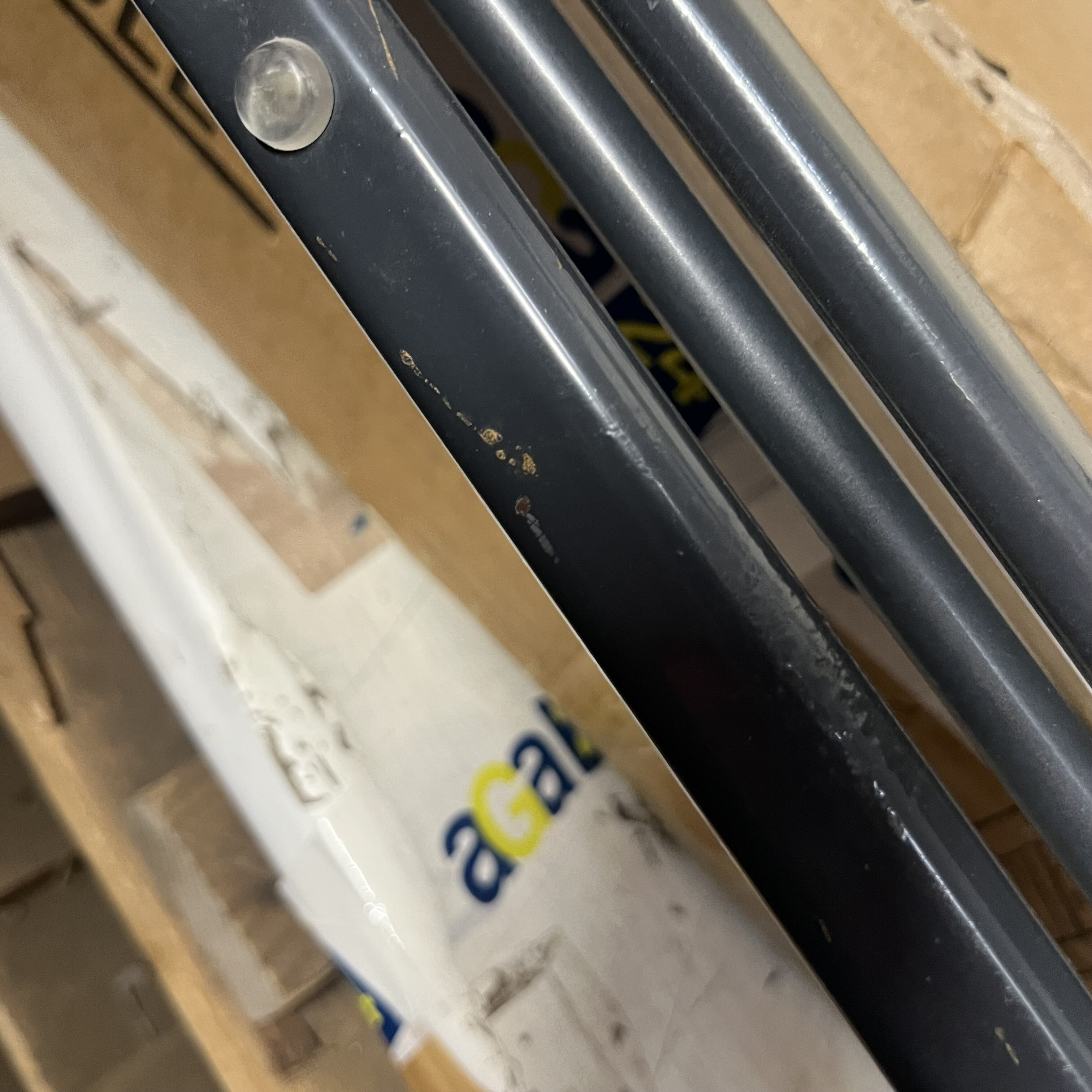 Stůl jeví známky poškození, rám se na jedné straně odlupuje, je poškrábaný a chybí koncovky u noh.