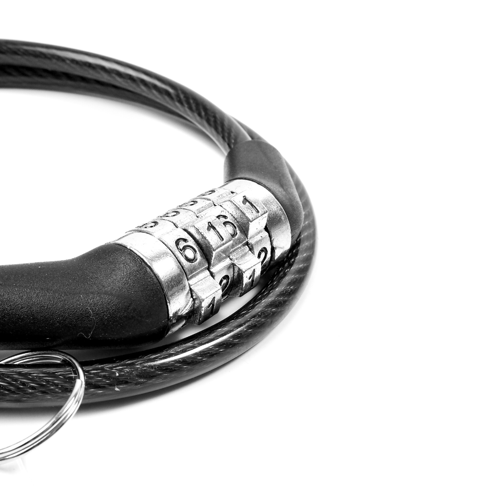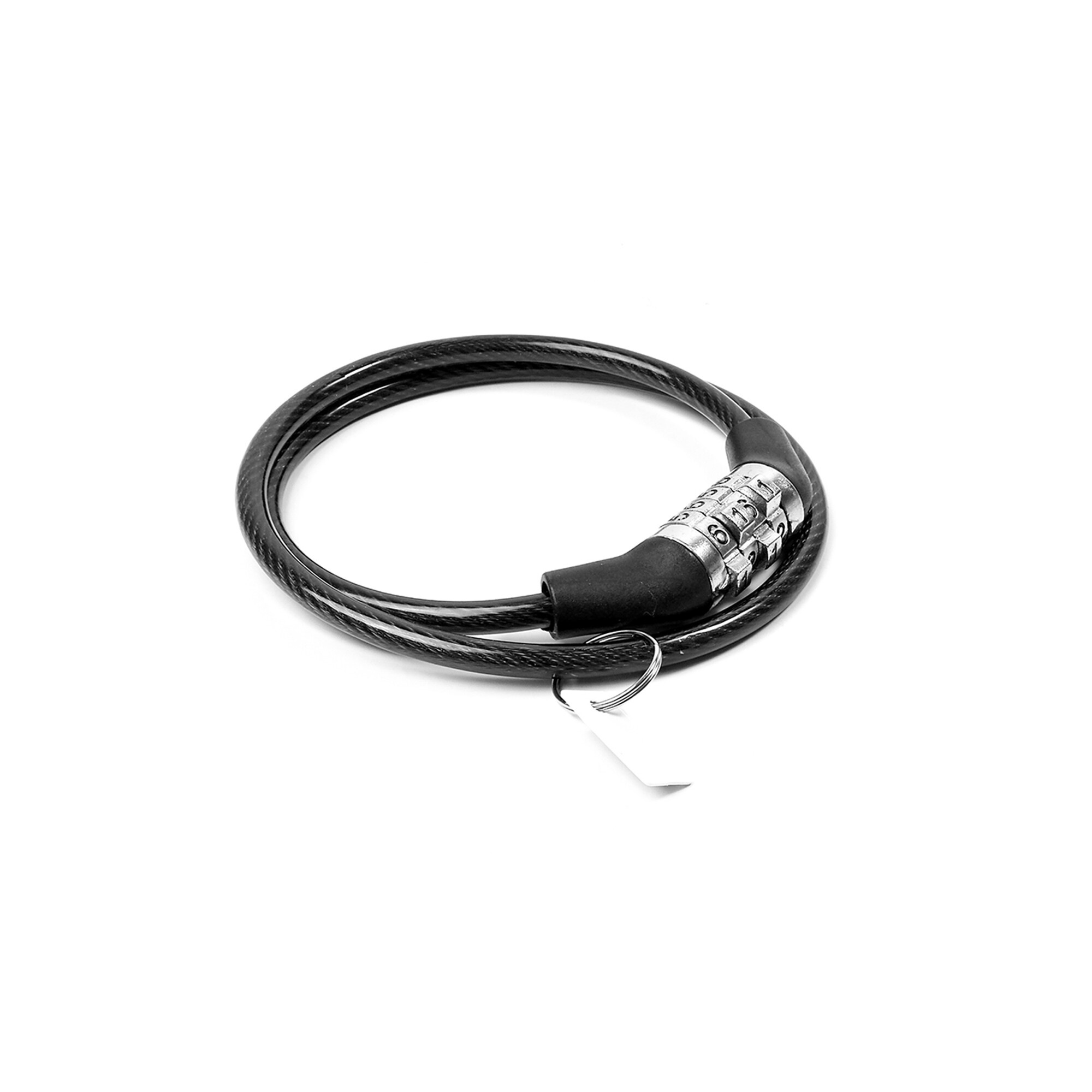 Tento kvalitní zámek na kolo je vyroben z tvrzené oceli chráněný povrchem z PVC, poskytuje stupeň zabezpečení a snadno se užívá. Otevírá se pomocí čtyřmístného kódovaného zámku. Na délku má 60 cm a na šířku 6 cm.