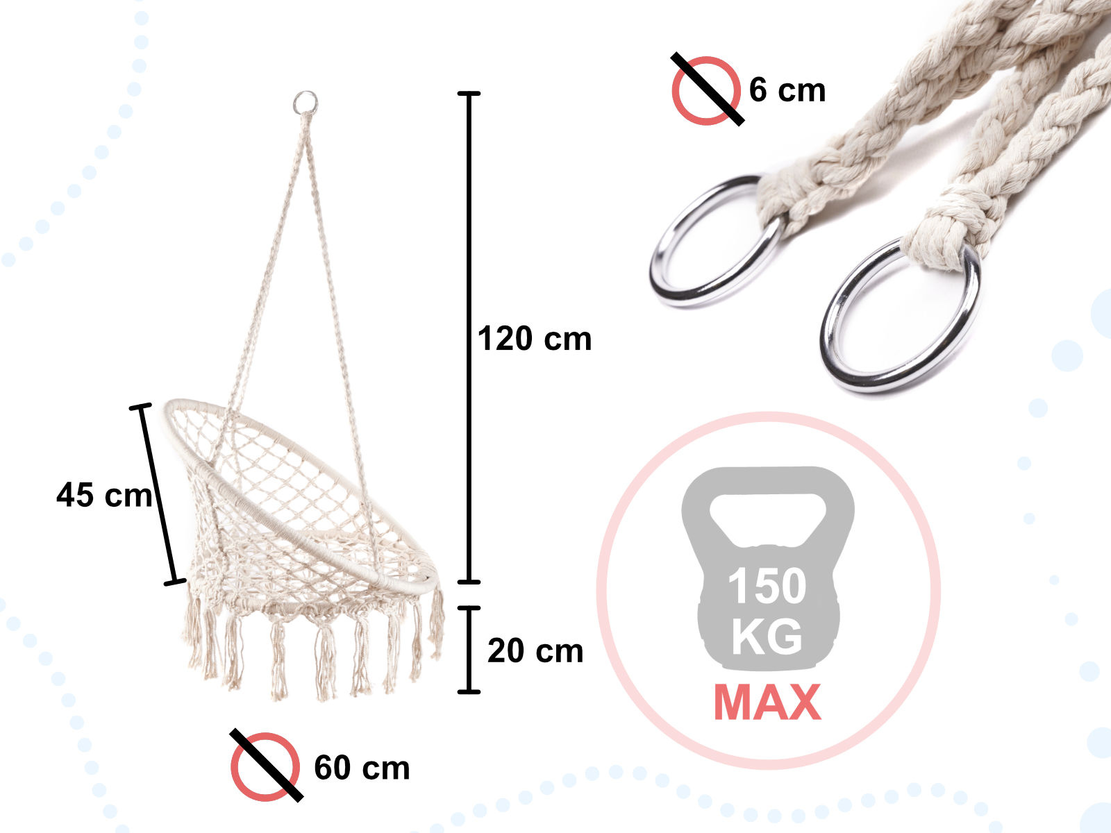 | bezpečnostní_text | Před použitím si přečtěte návod k obsluze. Montáž provádějte pouze na stabilní a pevné závěsné body. Pravidelně kontrolujte stav lan, upevňovacích prvků a konstrukce. Hořlavý výrobek. Uchovávejte mimo dosah ohně a zdrojů tepla. Výrobek není hračka. Obal není hračka. Maximální zatížení: 150 kg. |