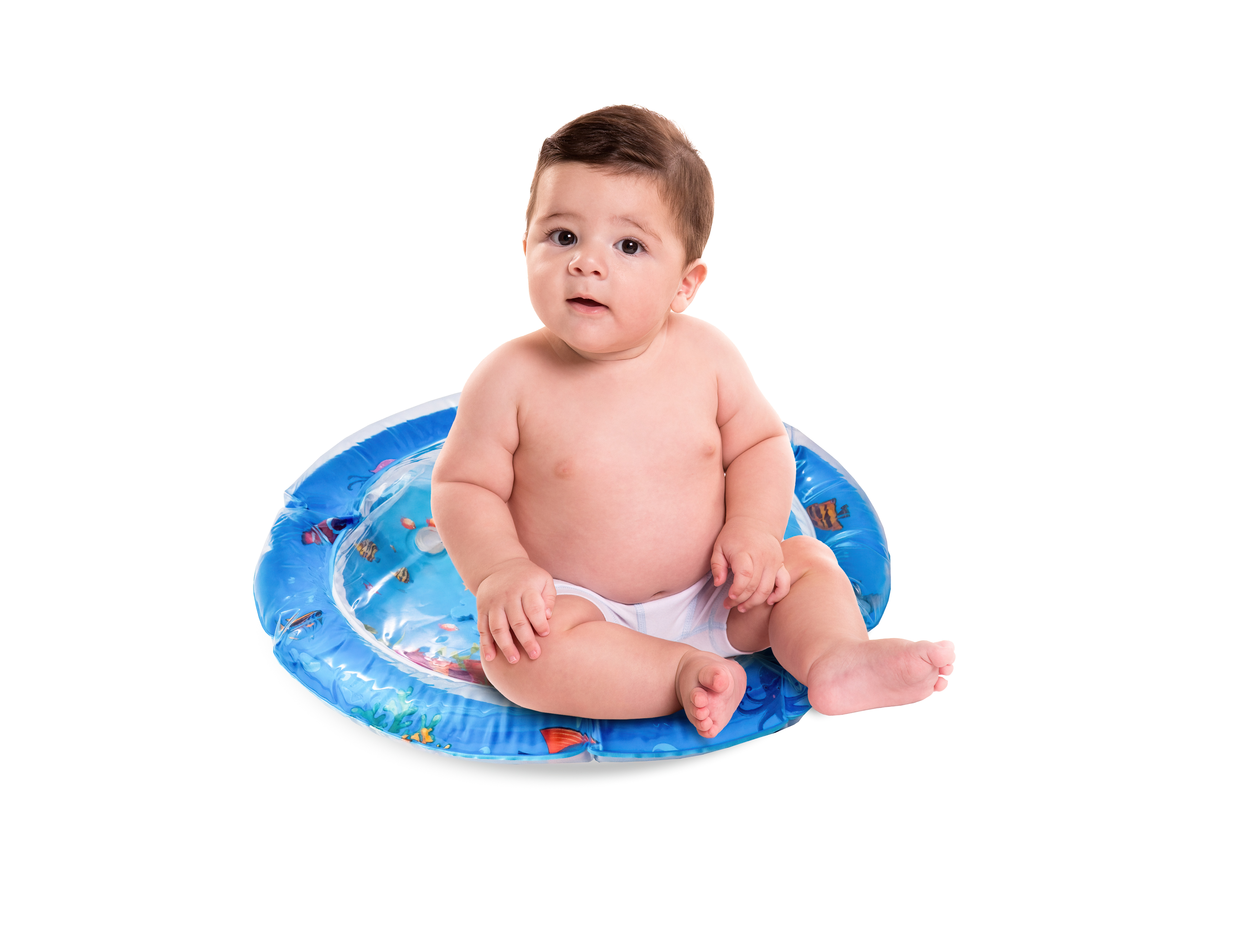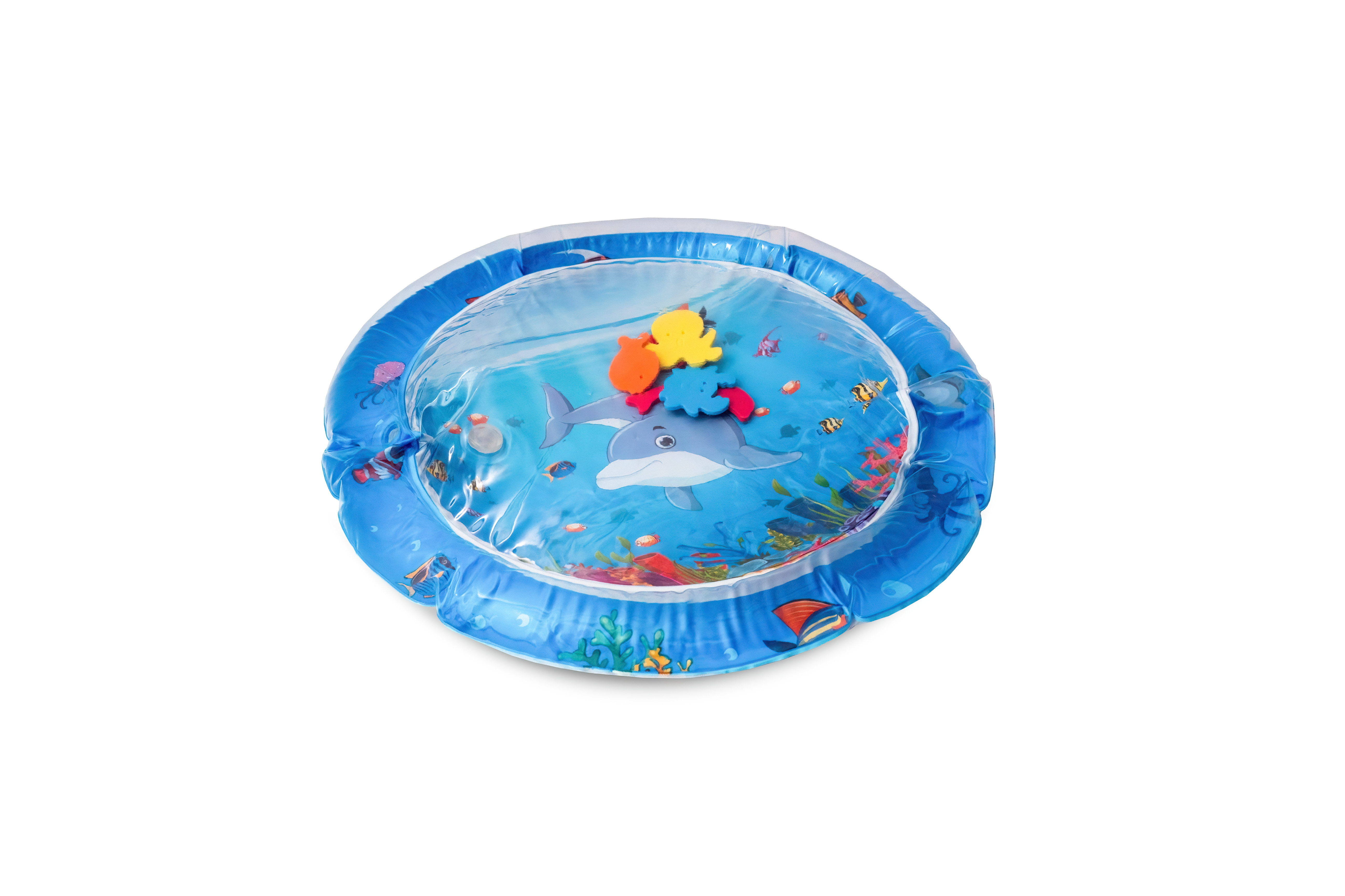 Stačí nafoukat okraj podložky a střed naplnit vodou popřípadě je možnost ji nafouknout. Díky vodě uvnitř se začnou pohybovat prvky ve tvaru mořských živočichů, které dítě povzbuzují ke hře.