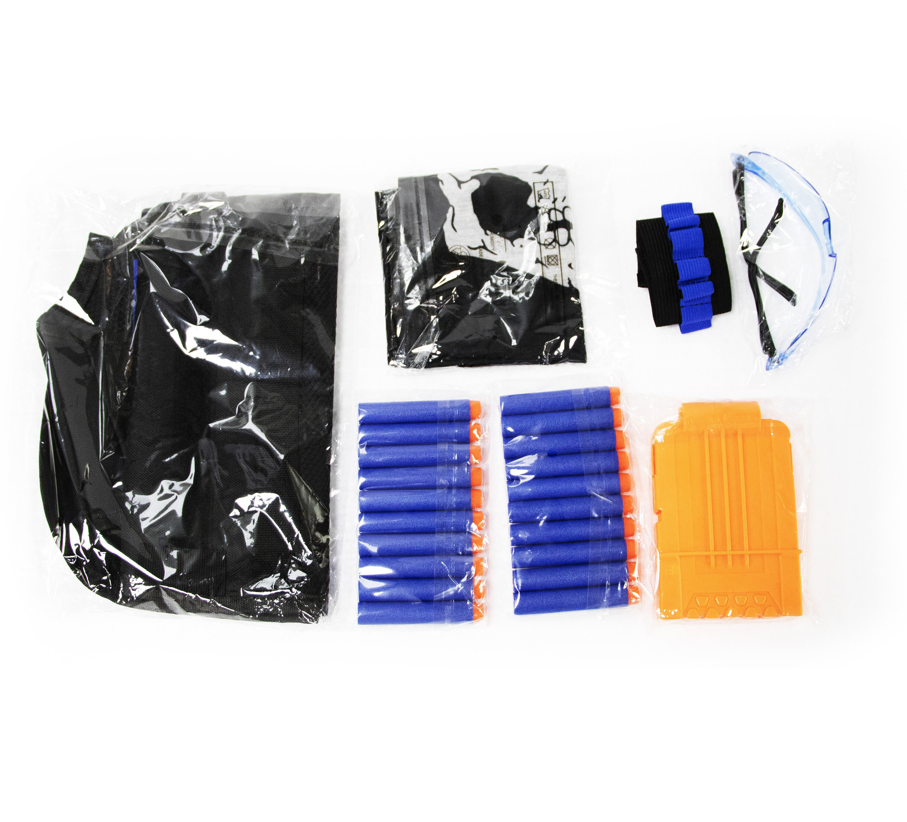 Ve vestě najdete místo pro uložení nábojů, příslušenství a držák na zásobník. V sadě naleznete i ochranné brýle, které mají ochrannou funkci.