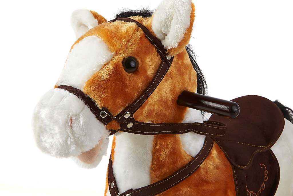 Po zmáčknutí oušek koník vydává zvuky řehtání, cválání, hýbe ohaňkou a tlamou.