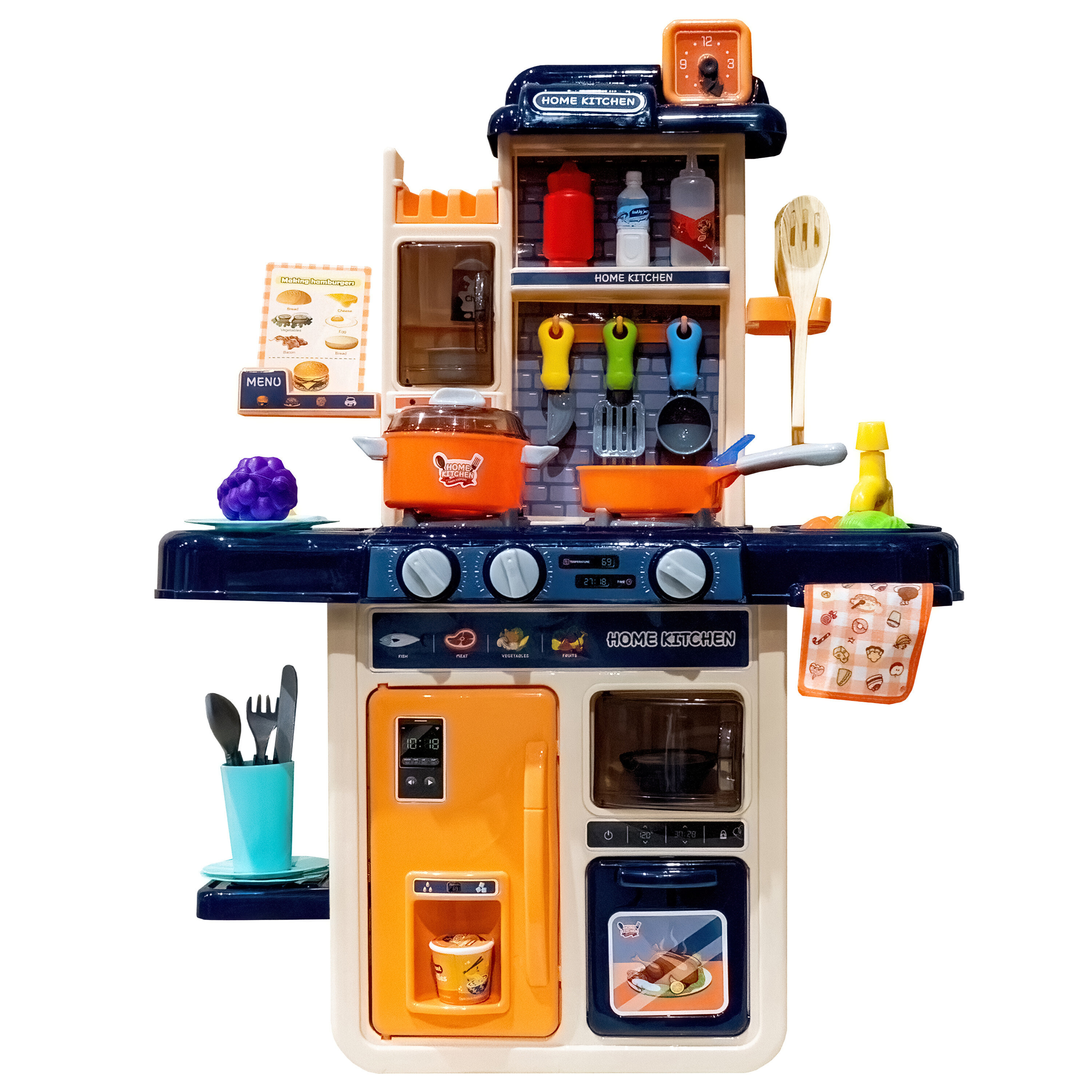 - Obsahuje spoustu různého příslušenství jako jsou hrnec, pánvička, pokličky, talíře, náčiní, jídlo aj.