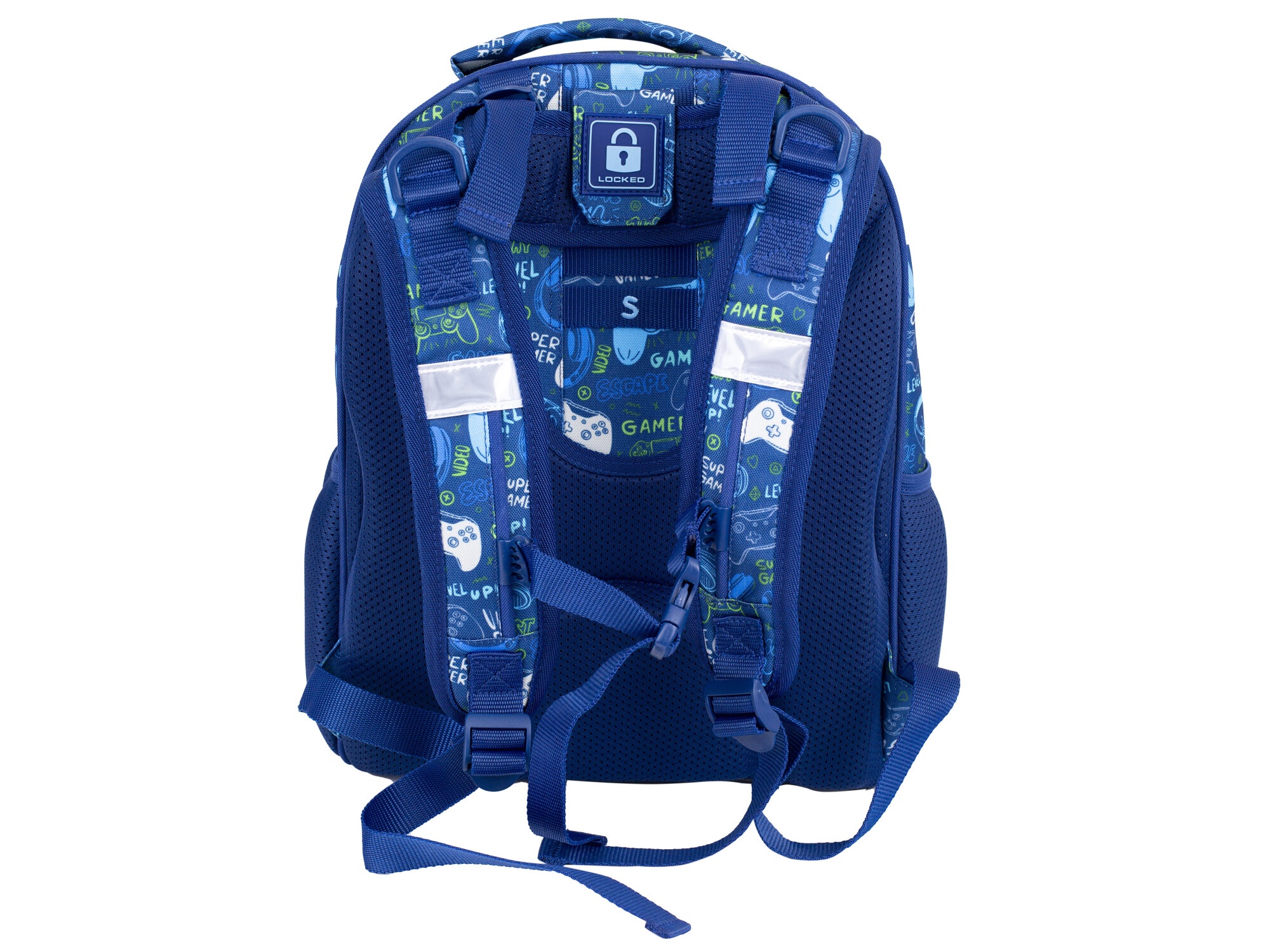 Taška má velký úložný prostor rozdělen vnitřní textilní přepážkou, do tašky se vejdou všechny potřeby, které školák do školy potřebuje