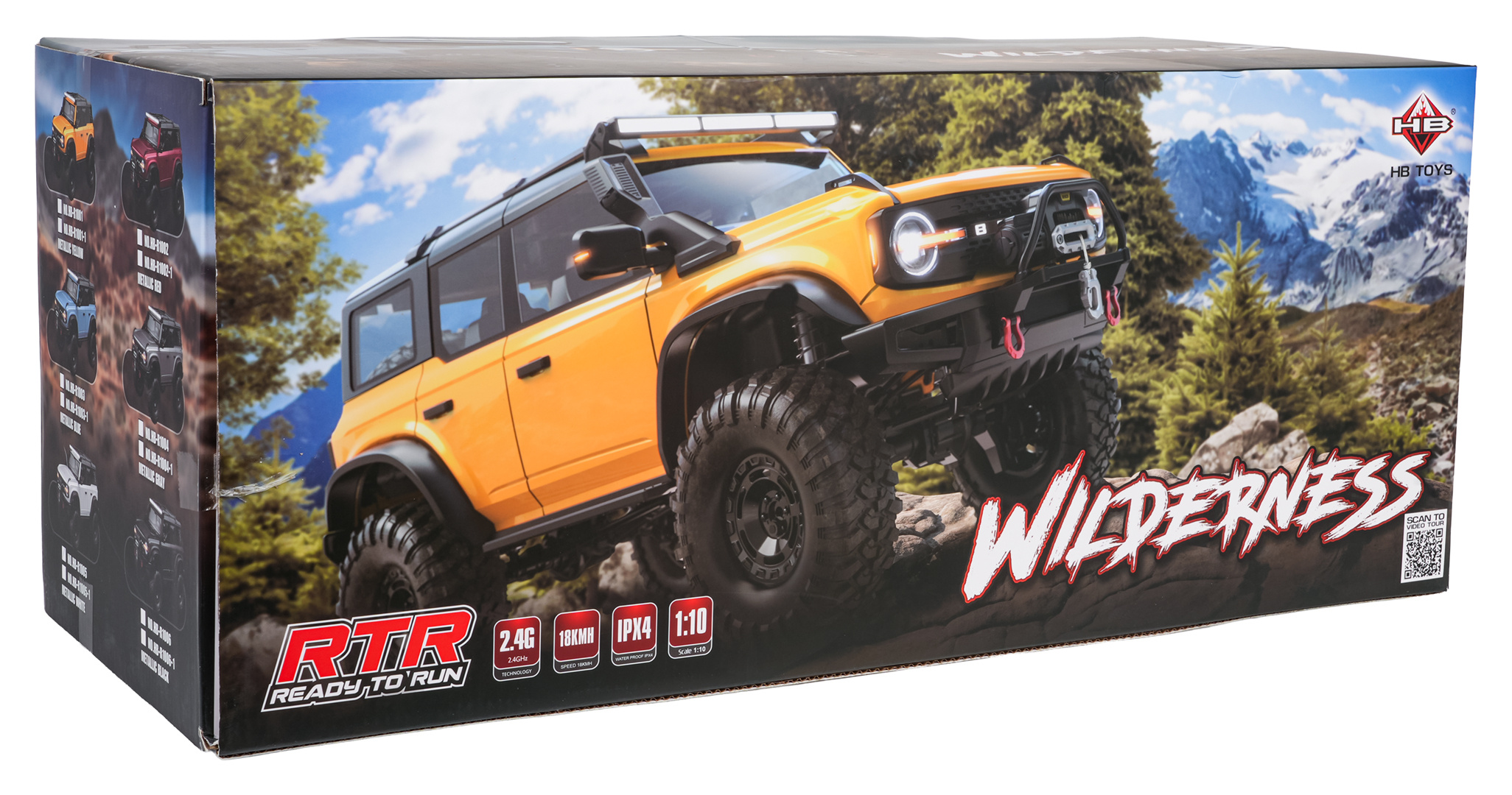 Dálkově ovládané auto Wilderness, vyrobené v měřítku 1:10, pro děti od čtrnácti let. Vozidlo má lakovanou karoserii, LED osvětlení: světlomety, brzdová světla, zpětná světla, směrová světla, po setmění vypadá nádherně. Individuální zavěšení na každé kolo, kovové tyče u ramen, vestavěný zadní a přední diferenciál. Velké gumové pneumatiky s běhounem, velmi velký úhel natočení způsobuje, že vozidlo překoná jakýkoli povrch. Na zadní části vozidla se nachází plnohodnotné rezervní kolo. Vozidlo jezdí všemi směry, snadno překonává překážky a navíc je vodotěsné. Maximální rychlost vozidla je 18 km/h, z ovladače můžeme nastavit konstantní rychlost vozidla. Na výběr máme dvě rychlosti. Auto je napájeno akumulátorem typu 7,4 V (v balení) a 4 x AA 1,5 V (není v balení) - ovladač.