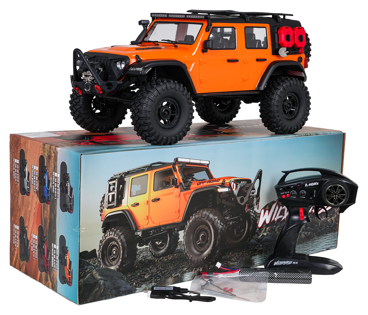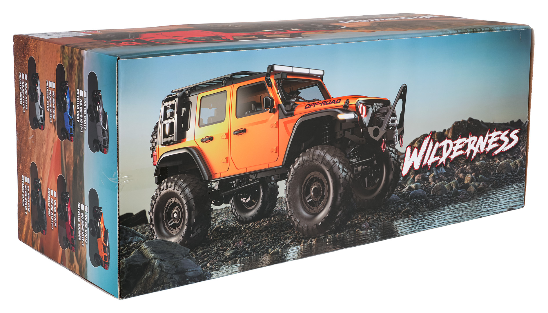 Dálkově ovládané auto Wilderness, vyrobené v měřítku 1:10, pro děti od čtrnácti let. Vozidlo má lakovanou karoserii, LED osvětlení: světlomety, brzdová světla, zpětná světla, směrová světla, po setmění vypadá nádherně. Individuální zavěšení na každé kolo, kovové tyče u ramen, vestavěný zadní a přední diferenciál. Velké gumové pneumatiky s běhounem, velmi velký úhel natočení způsobuje, že vozidlo překoná jakýkoli povrch. Na zadní části vozidla se nachází plnohodnotné rezervní kolo. Vozidlo jezdí všemi směry, snadno překonává překážky a navíc je vodotěsné. Maximální rychlost vozidla je 18 km/h, z ovladače můžeme nastavit konstantní rychlost vozidla. Na výběr máme dvě rychlosti. Auto je napájeno akumulátorem typu 7,4 V (v balení) a 4 x AA 1,5 V (není v balení) - ovladač.