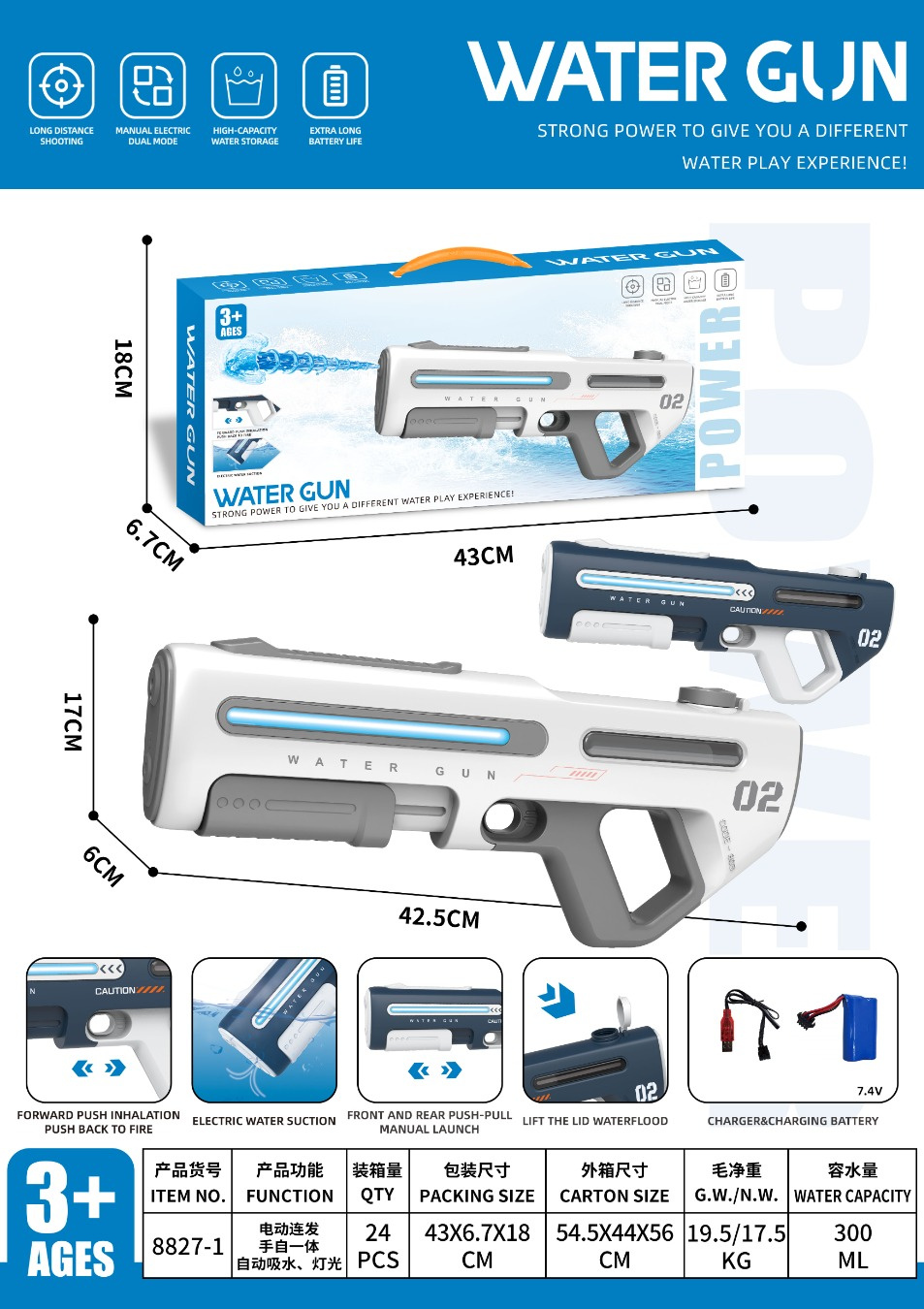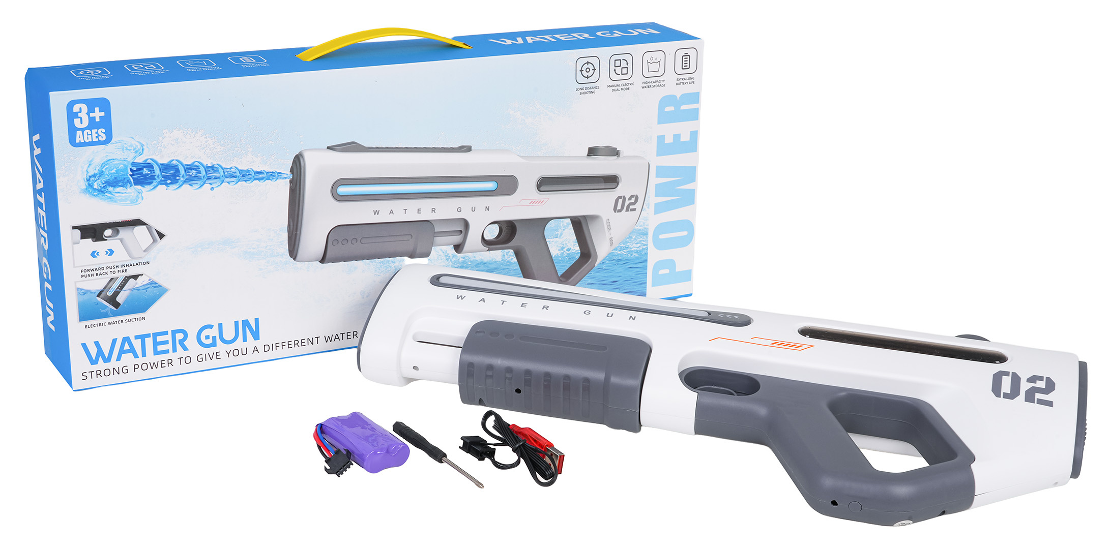 Elektrická vodní pistole s podsvícením pro děti od tří let. Pistole je vyrobena z nejkvalitnějších materiálů, napájena je akumulátorem typu 7,4V (v balení). Má podsvícení, což umožňuje zábavu i pozdě večer. Zásada fungování pistole je velmi jednoduchá. Doplňujeme nádržku na vodu, která se nachází v horní části pistole. A stiskneme spoušť. Pistole může být také používána bez napájení, manuálně.