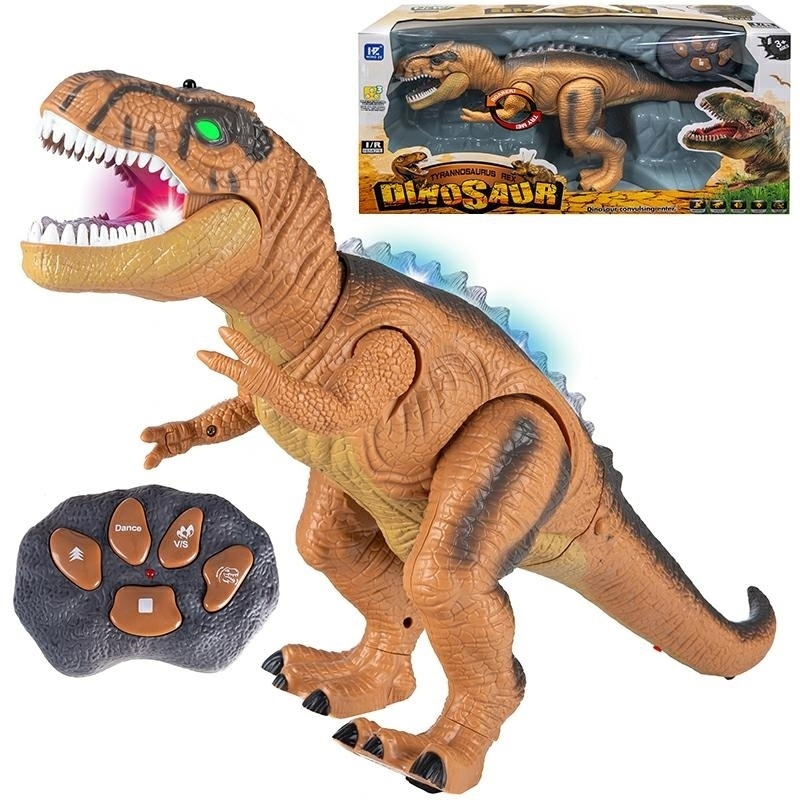 Dálkově ovládaný model tyranosaura. Robot ovládaný IR dálkovým ovladačem. Možnost pohybu vpřed, funkce tance, útoku, potřásání hlavou a zastavení modelu. Během hry se robot pohybuje dopředu a vydává realistické zvuky dinosaura, svítí mu oči, tlama a hřbet. Pohybuje hlavou, nohama a tlapkami. Vlastnosti produktu: - ovládání pomocí IR dálkového ovladače - 3 kanály ovládání (A, B, C) - zvukové efekty (řve), - světelné efekty (svítí mu oči, vícebarevný hřbet, tlama), - vizuální efekty (chodí, pohybuje hlavou, pohybuje tlapami, nohama a tlamou) - pohybuje se dopředu - rozměry: 44 cm x 26,5 cm x 16 cm - napájení dinosaura: 3 x AA (v balení) - napájení ovladače: 2xAA (není v balení) V balení: - Dinosaurus - Dálkový ovladač - Návod v polštině Hračka není vhodná pro děti mladší 3 let. rozměry balení: 51x27x19,5 cm Počet kusů na paletě: 50 Produkt zabalený v dalším kartonu - připraven k odeslání.