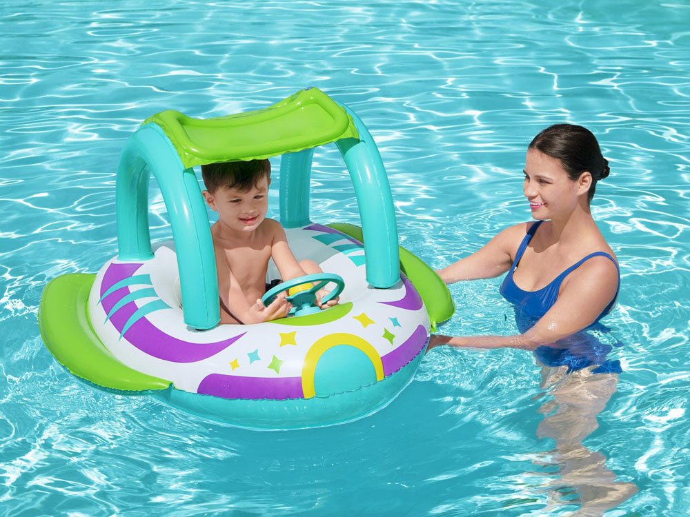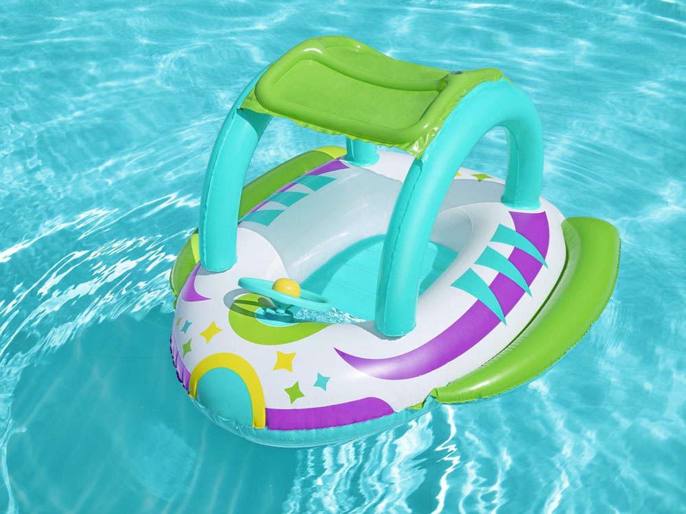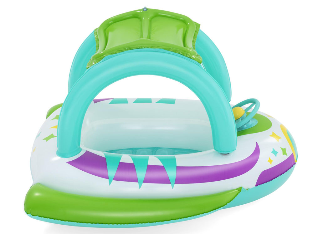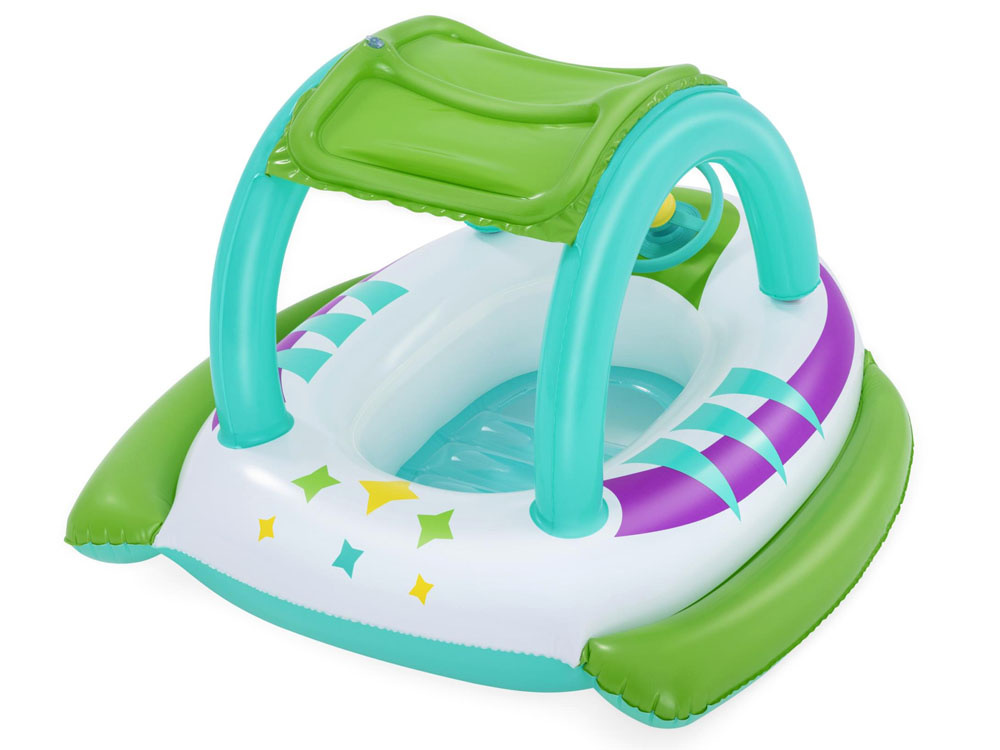 Nafukovací člun ve tvaru lodi s barevnou vesmírnou grafikou je nabídka společnosti Bestway® Space Splash™ pro děti od 3 let. Ponton byl speciálně vytvořen pro děti, které si teprve zvykají na vodu a ještě neumí samy zůstat ve vodě. Ponton má odnímatelnou sluneční stříšku UV Careful™, která poskytuje ochranu před sluncem pro vaše dítě a zároveň trochu stínu v horkých dnech. Stínítko je připevněno pomocí suchého zipu, který umožňuje snadnou montáž a demontáž stínítka. Dalším prvkem pontonu je nafukovací dno, které umožní, aby se dítě při plavbě po vodě cítilo pohodlně. Ve spodní části lodi je také průhledové okénko, které vašemu malému kapitánovi umožní vychutnat si výhled pod vodu, a vestavěný volant s klaksonem poskytne další zábavu. Loďka je vyrobena z odolného vinylu a v horkých dnech přinese každému dítěti spoustu zábavy při koupání ve vodě.