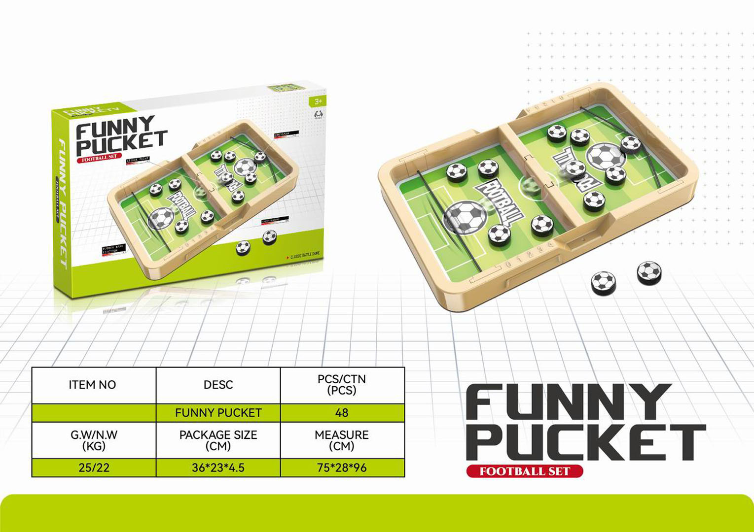 Stolní hra fotbal pro děti od tří let. Hra se skládá z desky napodobující hřiště a disků ve tvaru míčů. Hru mohou hrát dvě, nebo více osob. Úkolem hráčů je vstřelit co nejvíce gólů. Je třeba prokázat obratnost a rychlý postřeh. Míčky se vystřelují pomocí gumičky umístěné na obou stranách hřiště. Každý z týmů dostane po 5 míčků, ten tým, který umístí všechny své míčky na stranu soupeře, vyhrává. Emoce na vysoké úrovni zaručeny.