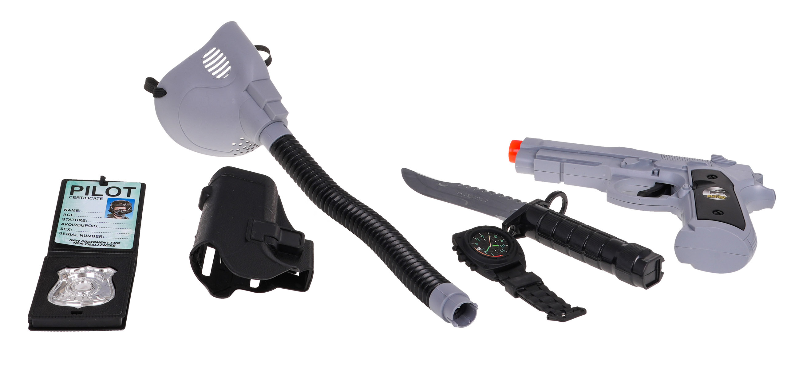 Sada Malý pilot je určena pro děti od 3 let. Sada vám umožní napodobit hru skutečného pilota. Obsahuje helmu, vestu, kyslíkovou masku, pistoli, pouzdro, pilotní průkaz, hodinky a nůž. Přilba má brýle s plastovými skly a nastavitelný pásek s přezkou. Pilotní vesta se zapíná na elastický pásek. Pistole je napájena 3 bateriemi AG13 (baterie jsou součástí balení) a vydává zvuk střelby. Celá sada byla vyrobena s důrazem na detail a je pro dítě zcela bezpečná.