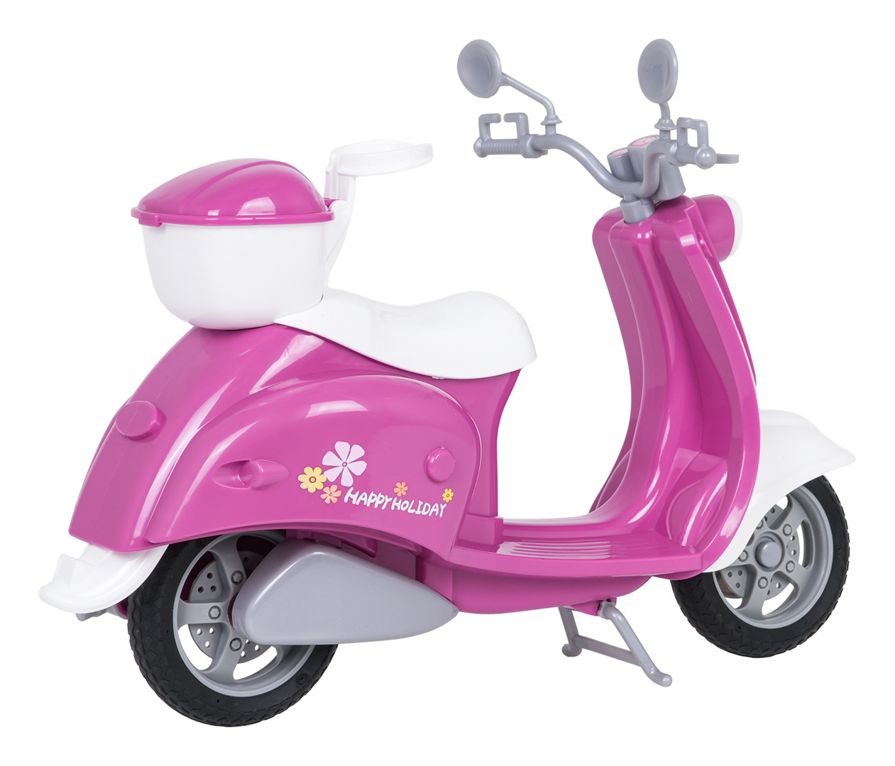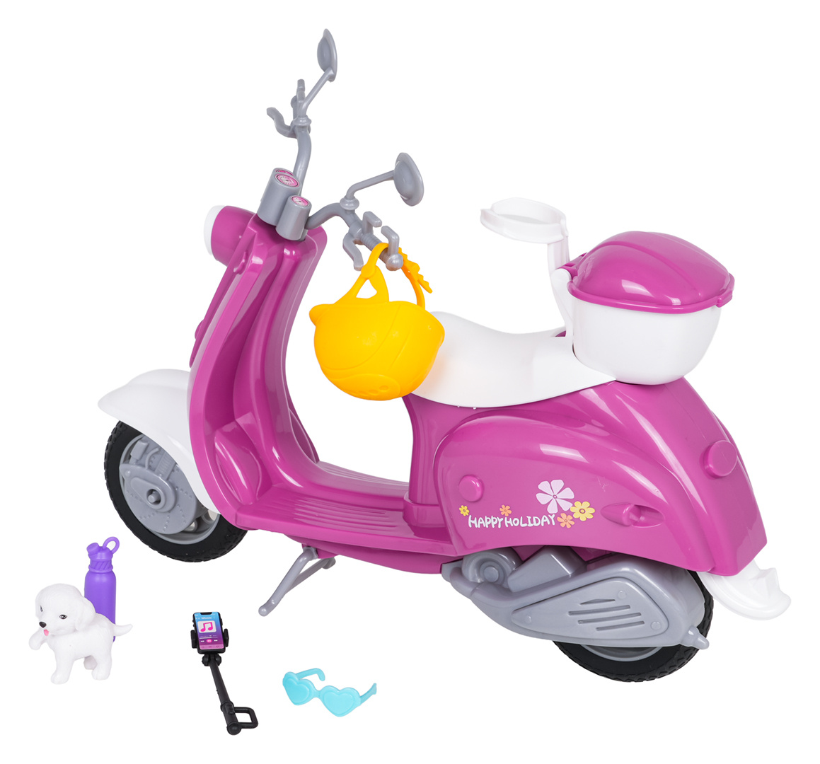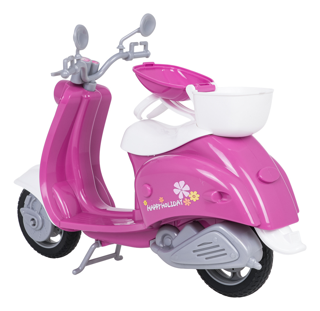Skútr pro panenky s doplňky pro děti starší tří let. Sada je vyrobena z nejkvalitnějších materiálů v živých barvách, které přitahují pozornost dítěte a povzbuzují ke hře. Růžovo-bílý skútr má vzadu koš, aby mohl přepravovat různé drobnosti, a k sadě je přiložena helma, brýle, držák na telefon, láhev na vodu a pejsek.