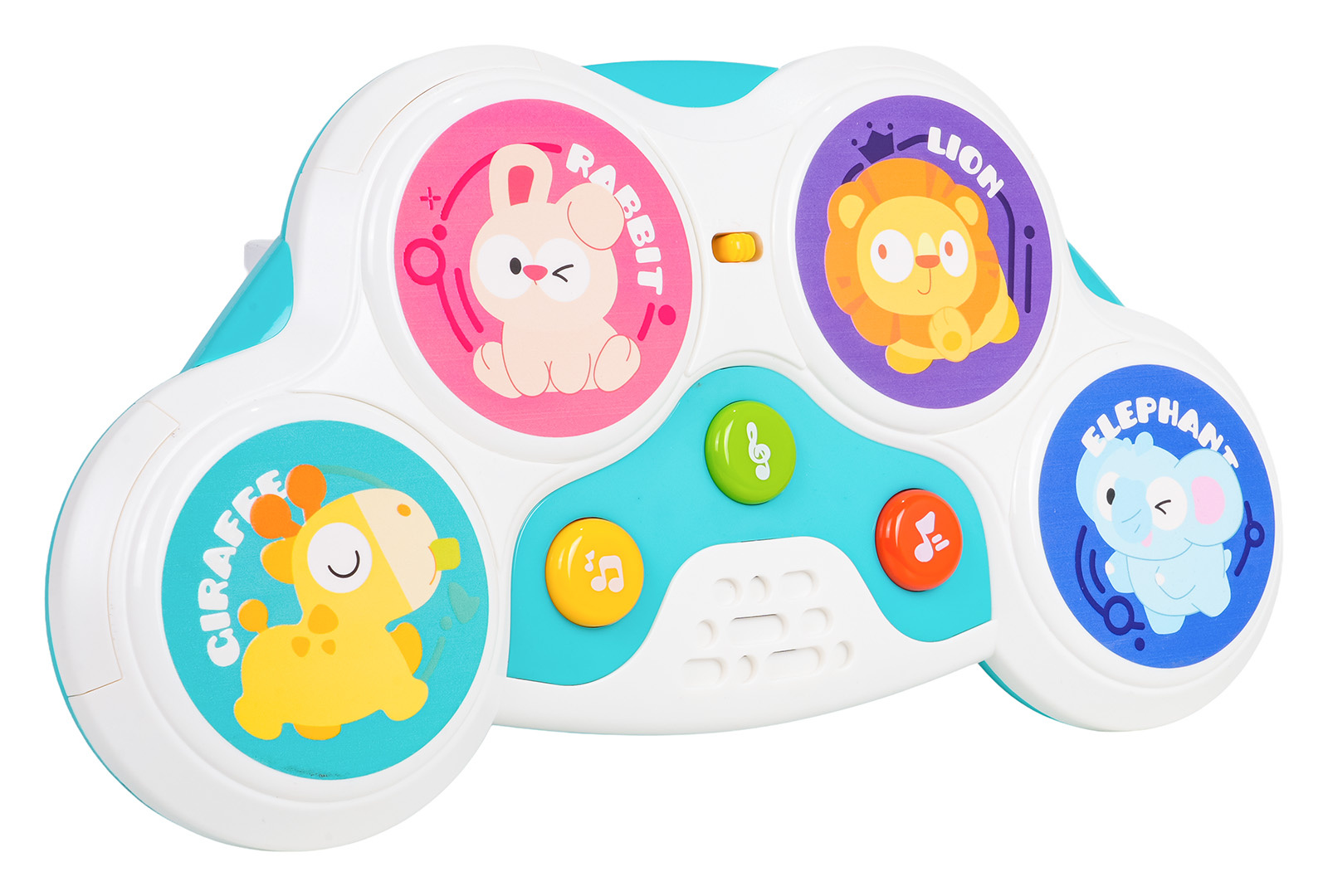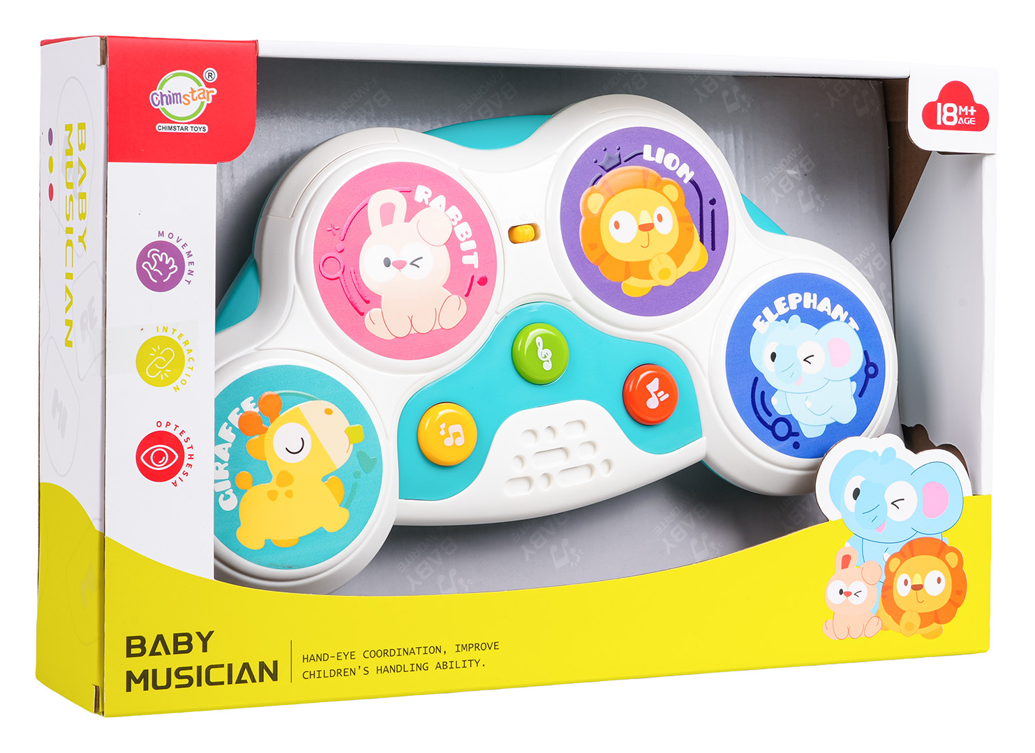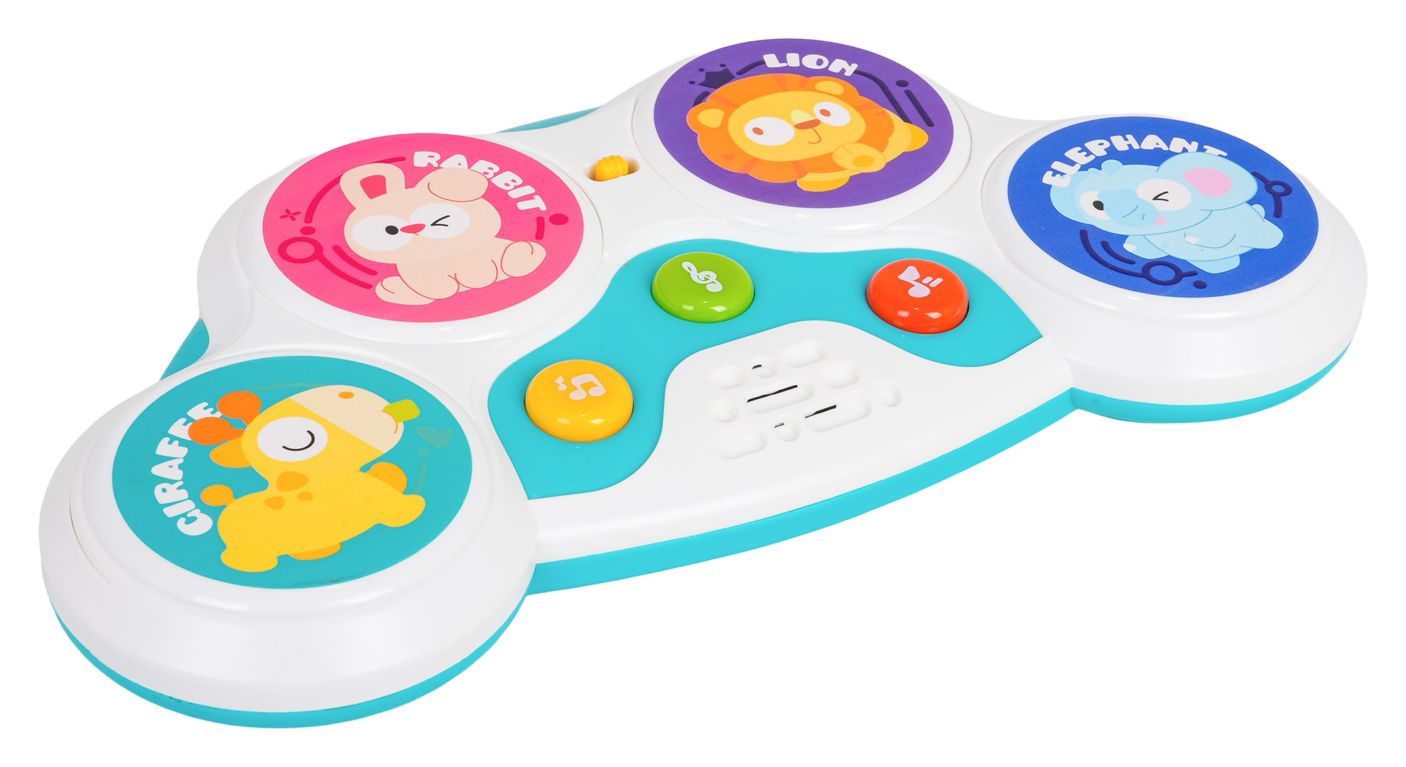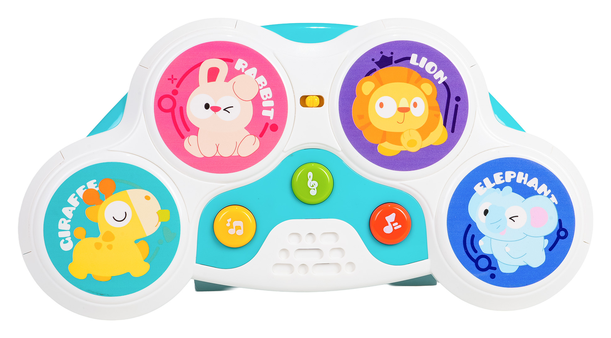 Interaktivní dotyková bicí souprava pro nejmenší od osmnáctého měsíce života. Hračka je vyrobena z nejkvalitnějších materiálů a nemá ostré hrany. Zvukové a světelné efekty a bohatství barev stimulují smysly dítěte na mnoha úrovních. Dotykové bubny mají barevné obrázky veselých zvířátek: žirafy, králíka, lva a slona. Po stisknutí nejsou slyšet zvuky zvířátek, melodie, rytmy bubnů a blikají barevná světýlka po celé délce boku hračky. Hračka je napájena bateriemi typu 3 x AAA 1,5V (nejsou součástí balení).