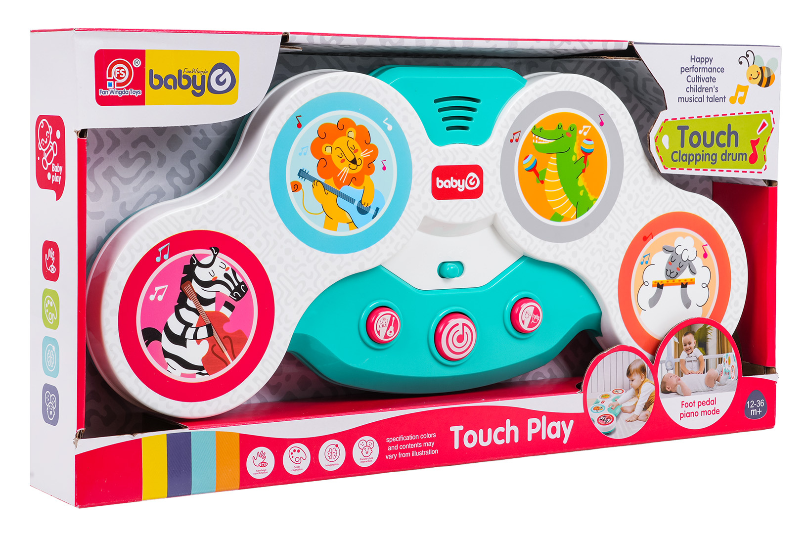 Interaktivní dotyková bicí souprava pro nejmenší od dvanáctého měsíce života. Hračka je vyrobena z nejkvalitnějších materiálů a nemá ostré hrany. Zvukové efekty a bohatství barev stimulují smysly dítěte na mnoha úrovních. Dotykové bubny mají barevné obrázky veselých zvířátek: zebry, lva, krokodýla a beránka s nástroji. Pod bubny byla umístěna dvoustupňová regulace hlasitosti a níže 3 kulaté tlačítka. Tlačítko s kytarou spouští zvuky nástrojů, které drží zvířátka, a zvuky těchto zvířátek. Tlačítko s notou veselé melodie a tlačítko s bicími její různé zvuky. Hračka je napájena bateriemi typu 3 x AA 1,5V (nejsou součástí balení).