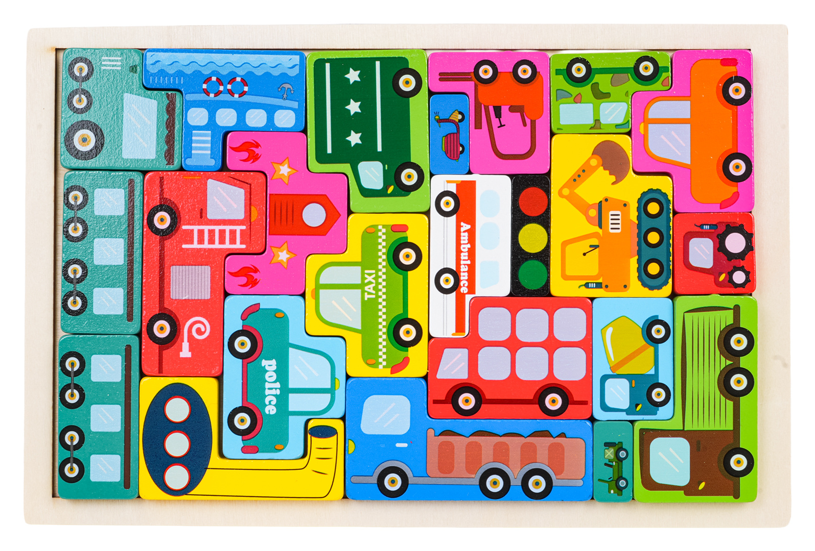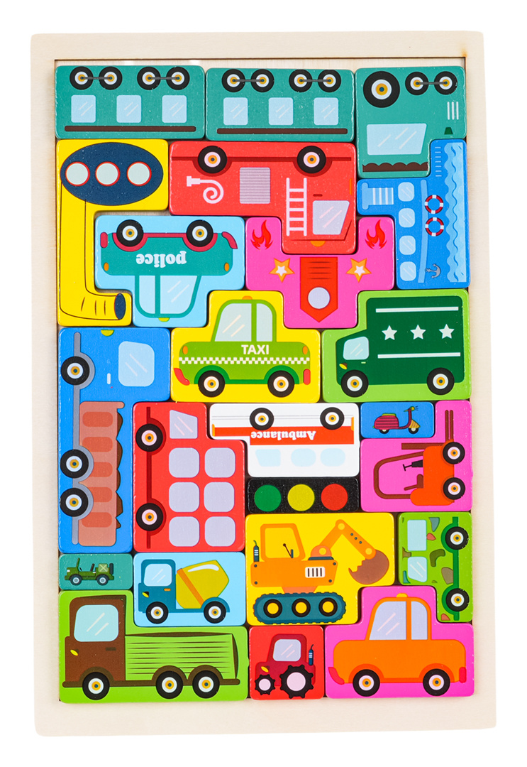 Dřevěná skládačka s vozidly pro děti od tří let. Sada je vyrobena z spolehlivého dřeva a natřena barvami bezpečnými pro děti. Úkolem dítěte je přizpůsobit tvary a poskládat všechny kostky. Hračka rozvíjí schopnosti logického myšlení, učí tvary a barvy.