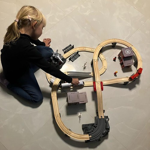 - dominantní materiál: dřevo, ostatní: PP + ABS + železo + magnet + papír) - sada obsahuje 44 kolejových prvků, 2 stromy, 2 značky, 2 budovy, 2 závory, 2 figurky, 1 osobní vlak, 1 vrtulník, 1 hasičský sbor , 1 nákladní automobil s návěsem