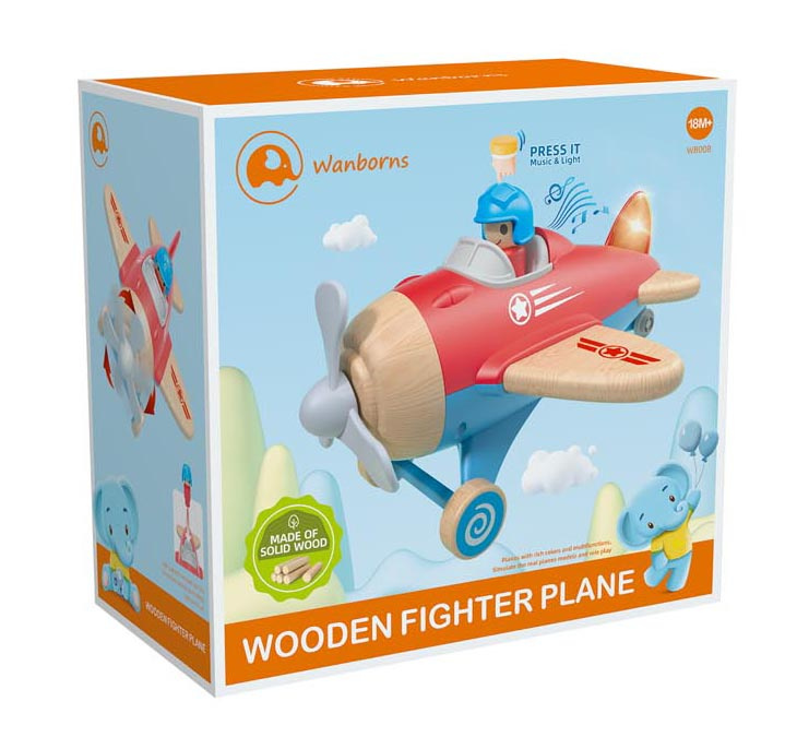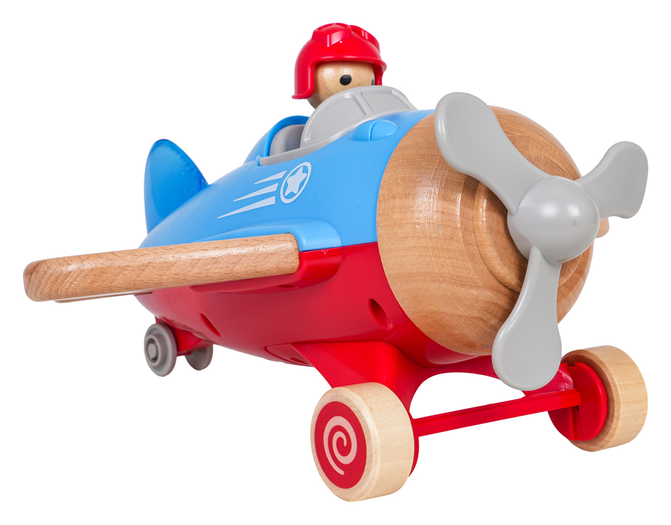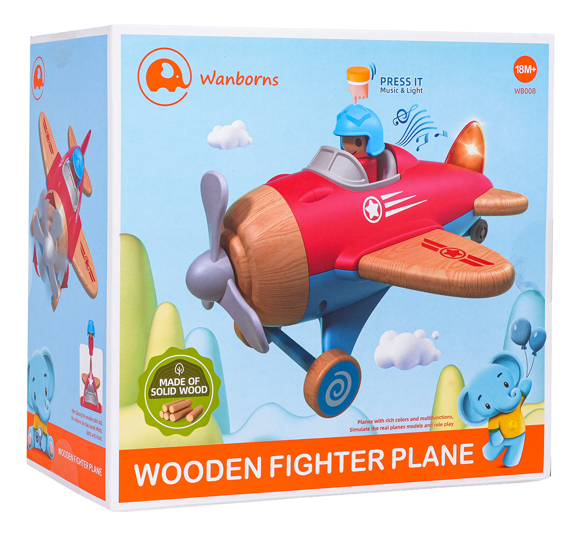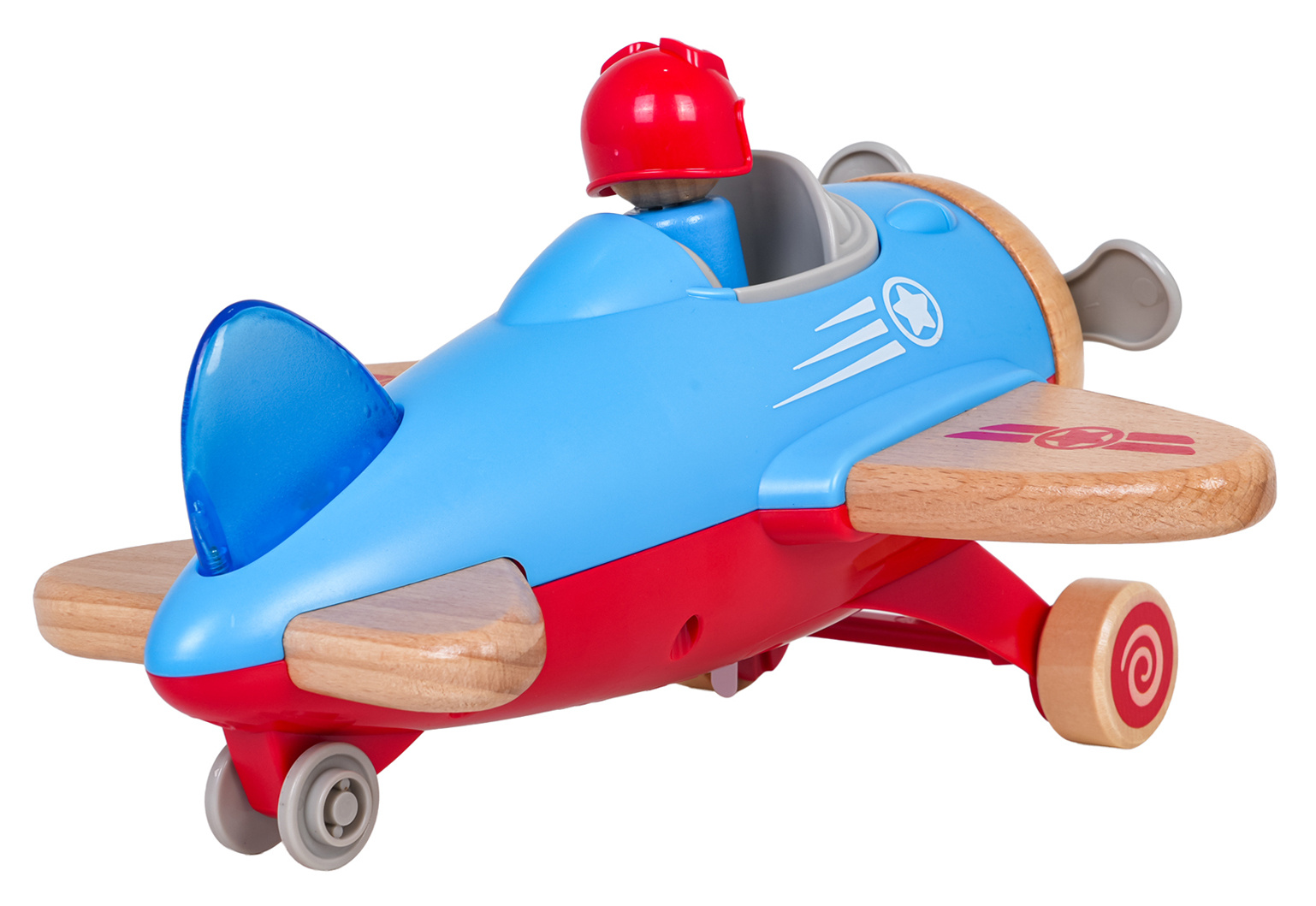 Interaktivní letadlo s funkcí zvuku a světla pro děti od osmnácti měsíců. Letadélko bylo vyrobeno z nejkvalitnějších materiálů: dřeva a plastu. Bohatství barev přitahuje pozornost dítěte a povzbuzuje ho ke hře. Letadélko má podsvícení zadního křídla a funkci zvuků, přehrává melodii a zvuky startu letadla po stisknutí figurky letce. Hračka je napájena bateriemi typu 3 X AG13 (baterie jsou součástí balení).