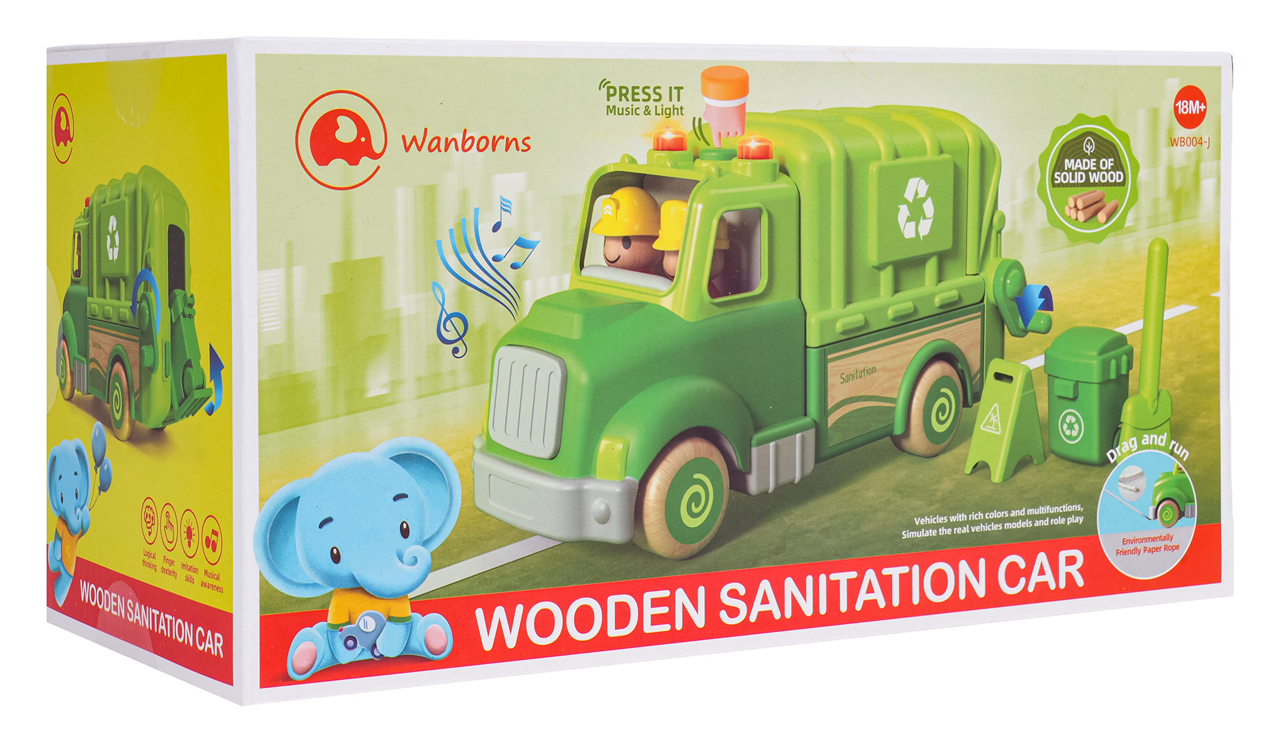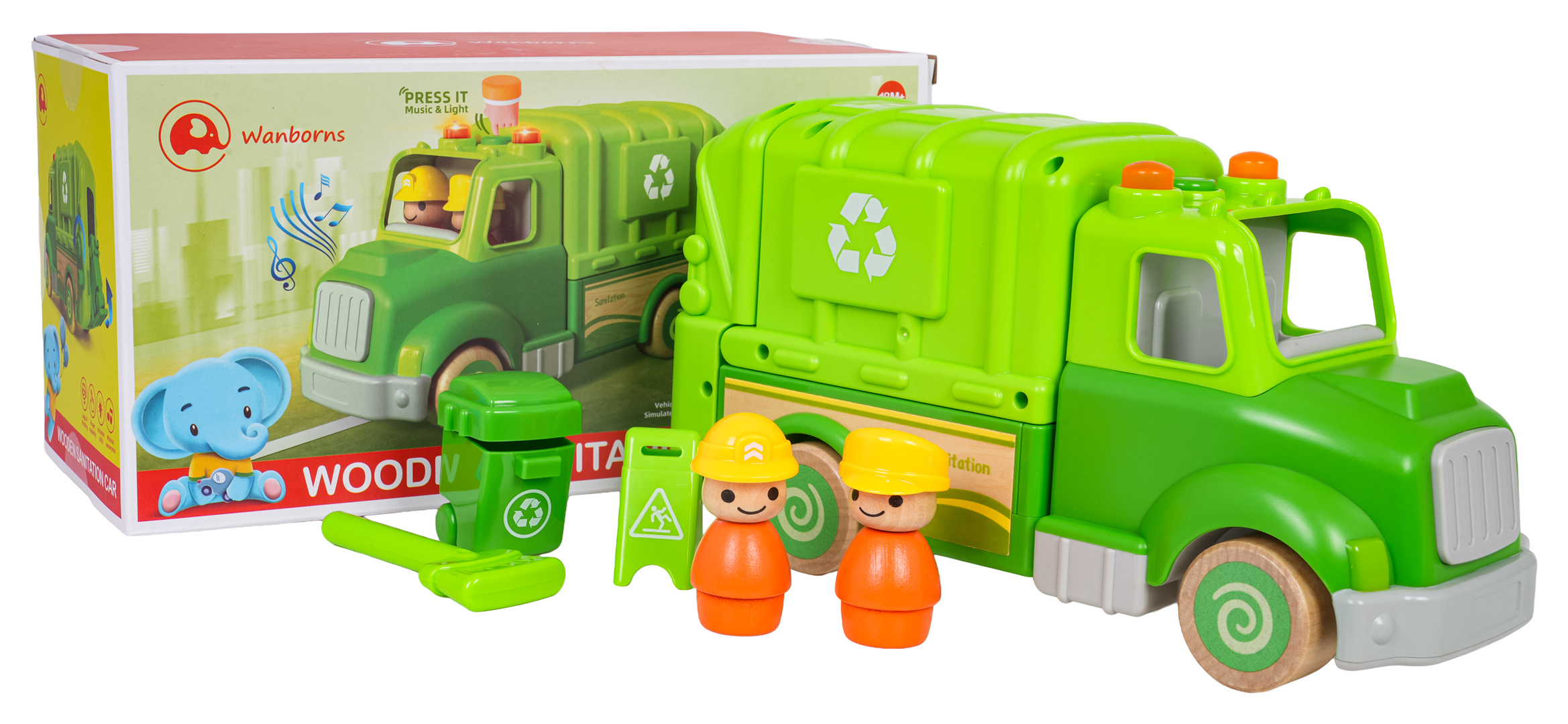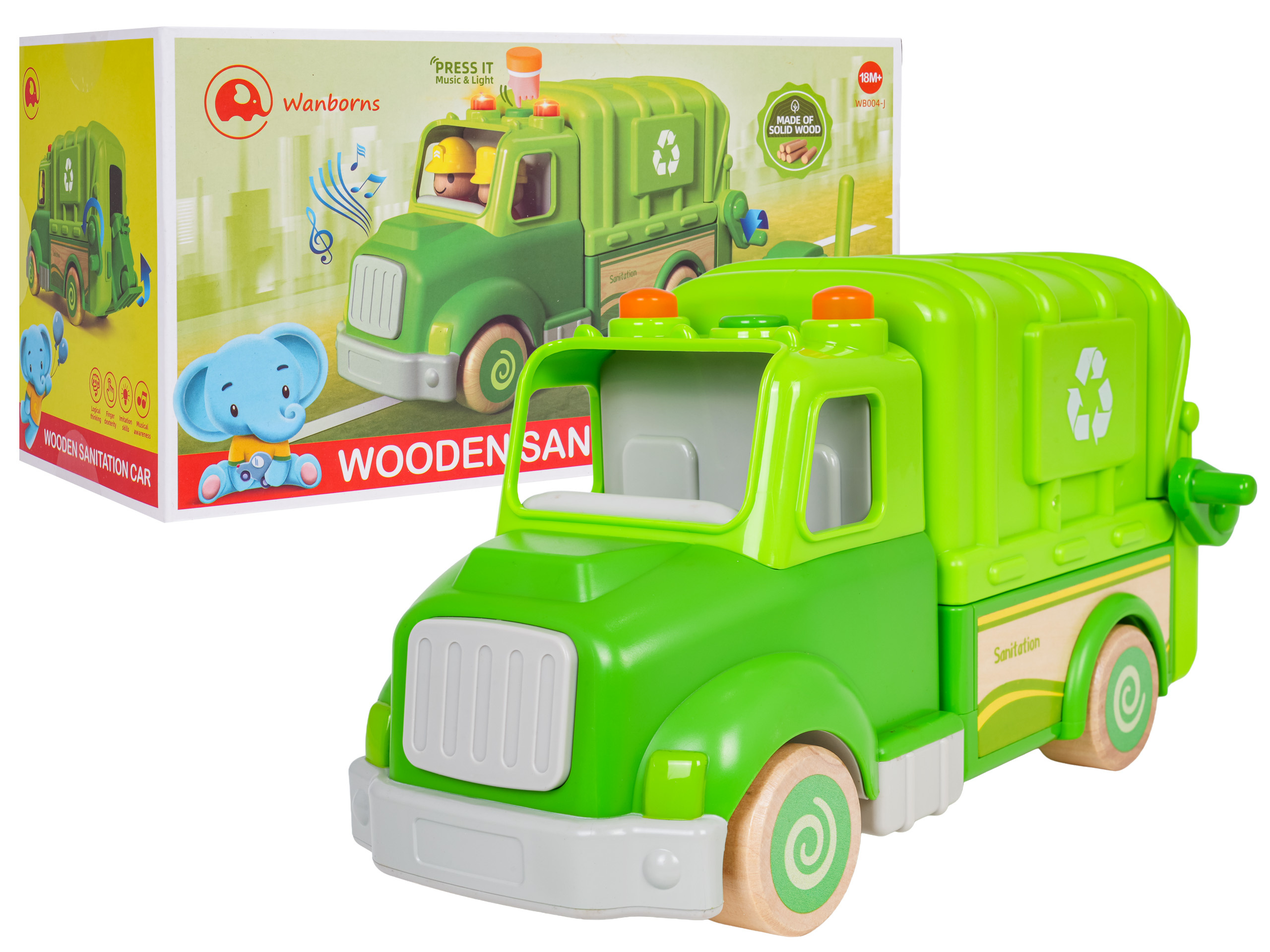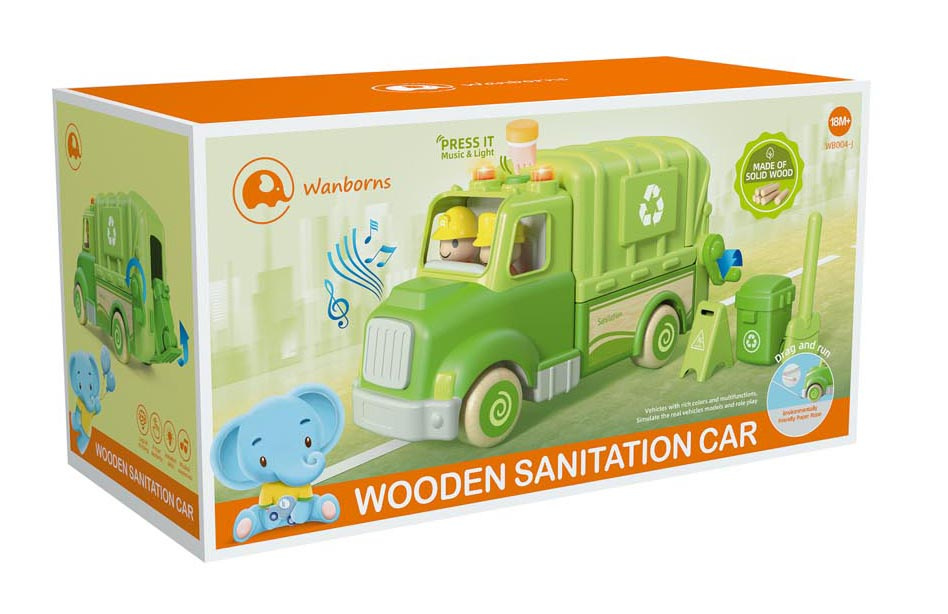 Interaktivní popelářské auto s funkcí zvuku a světla pro děti od osmnácti měsíců. Hračka byla vyrobena z nejkvalitnějších materiálů: dřeva a plastu. Nemá ostré hrany. Smetiarka má funkční zvedák na popelnice (kličku) a funkci vysypávání. Na střeše popelářského vozu se nachází tlačítko, které spouští melodie a světelné efekty v podobě blikajících světýlek. V sadě můžeme najít 2 figurky, odpadkový koš, smetáček a varovný znak. Hračka je napájena bateriemi typu 3 x AG13 (v balení).