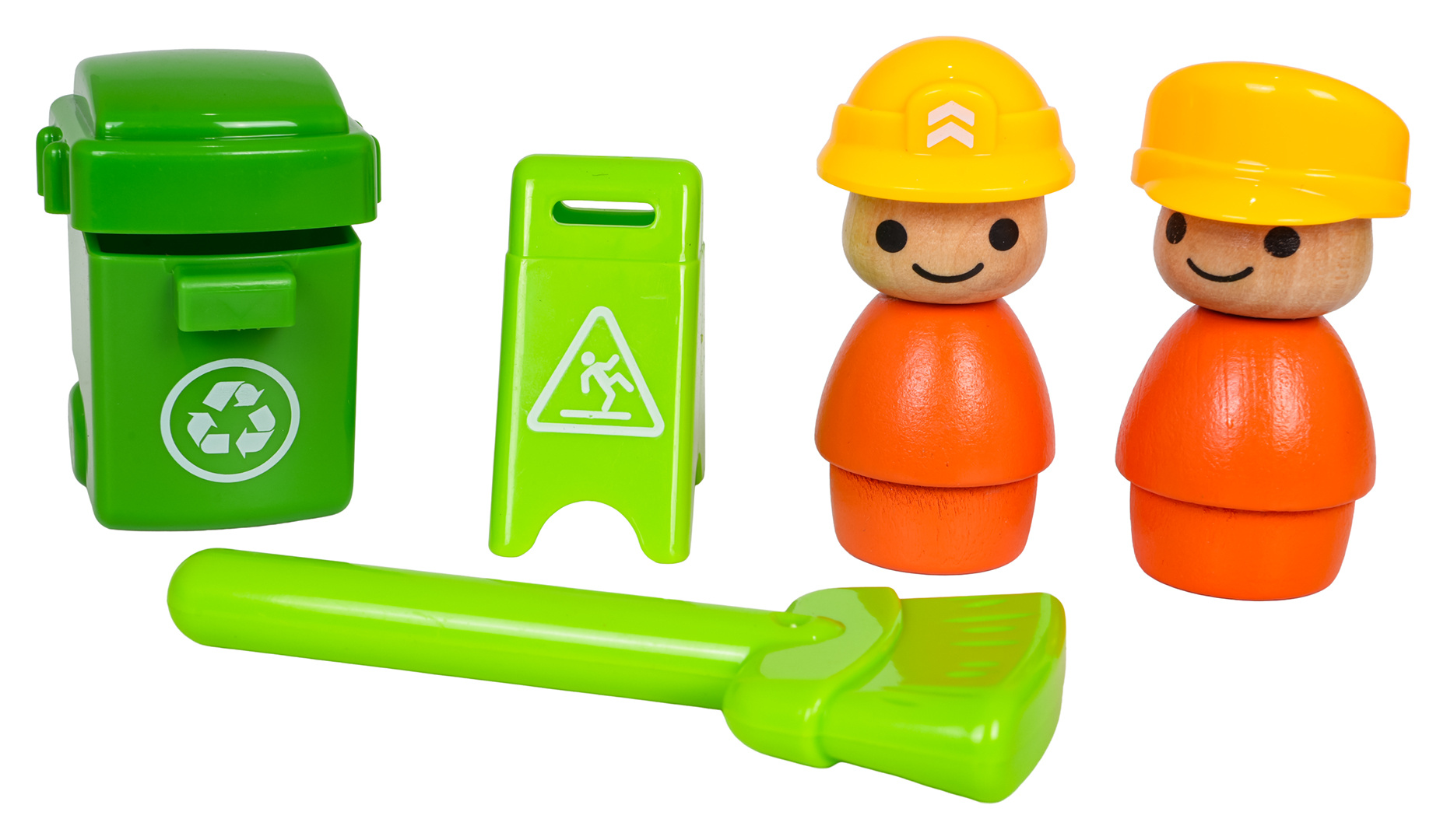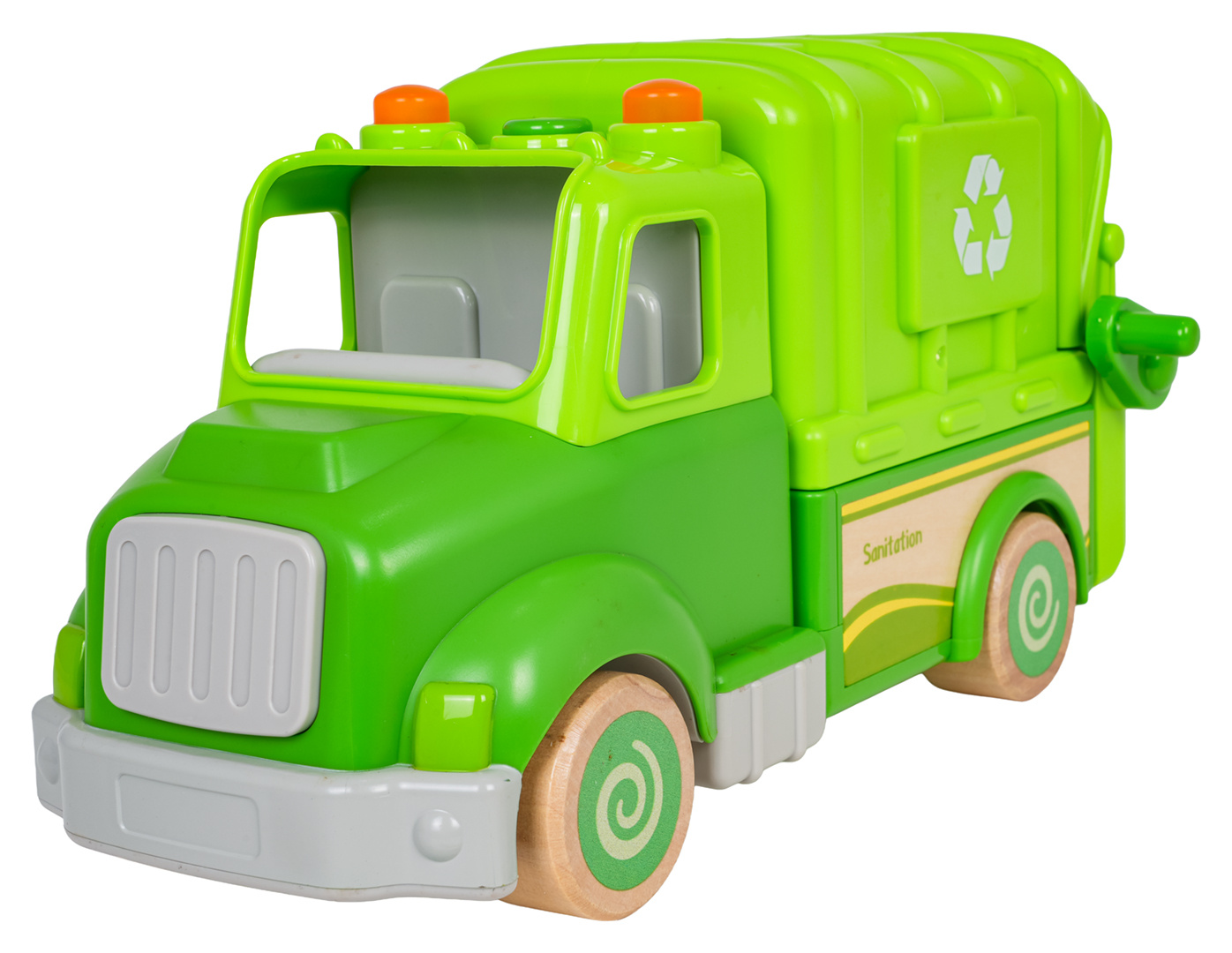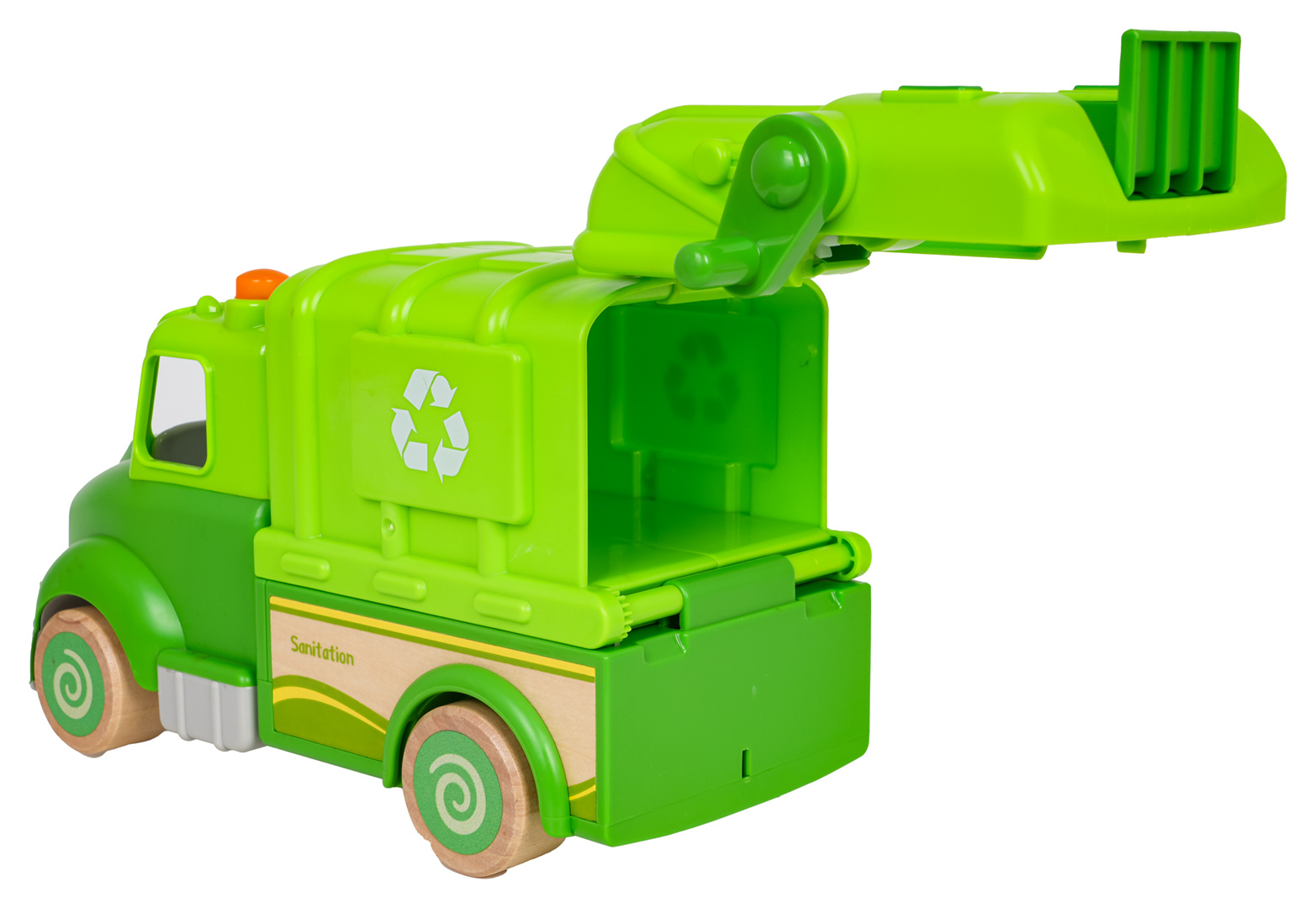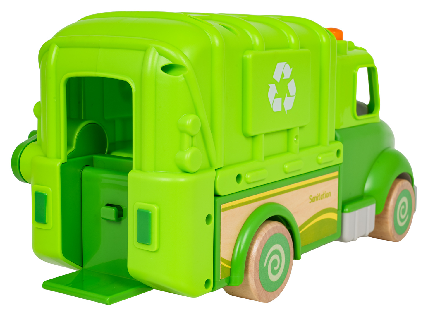Interaktivní popelářské auto s funkcí zvuku a světla pro děti od osmnácti měsíců. Hračka byla vyrobena z nejkvalitnějších materiálů: dřeva a plastu. Nemá ostré hrany. Smetiarka má funkční zvedák na popelnice (kličku) a funkci vysypávání. Na střeše popelářského vozu se nachází tlačítko, které spouští melodie a světelné efekty v podobě blikajících světýlek. V sadě můžeme najít 2 figurky, odpadkový koš, smetáček a varovný znak. Hračka je napájena bateriemi typu 3 x AG13 (v balení).