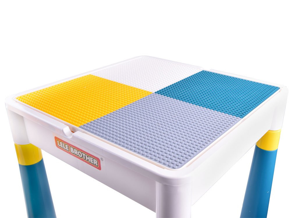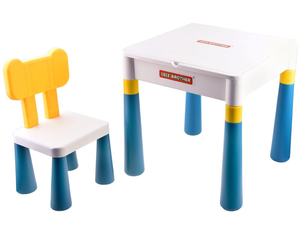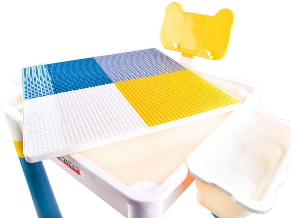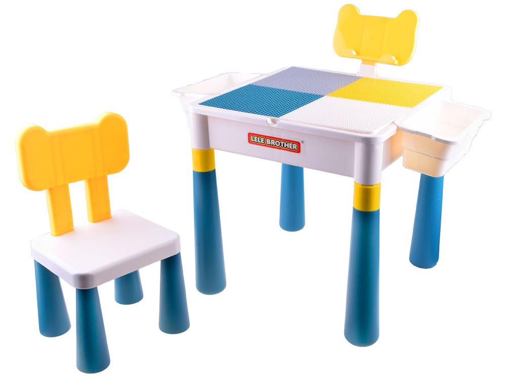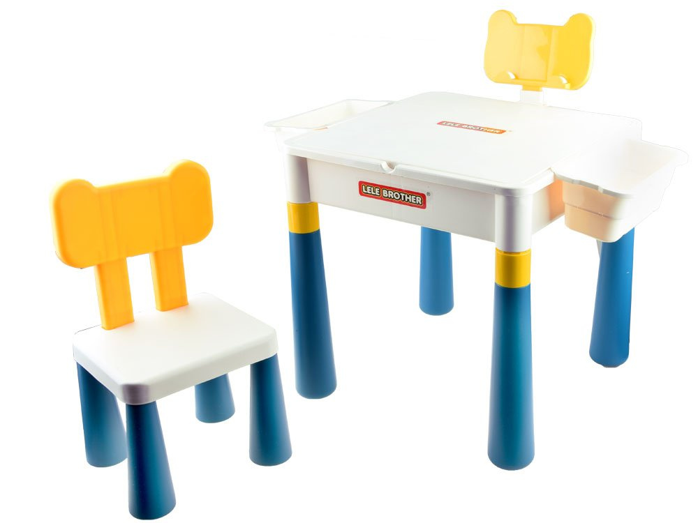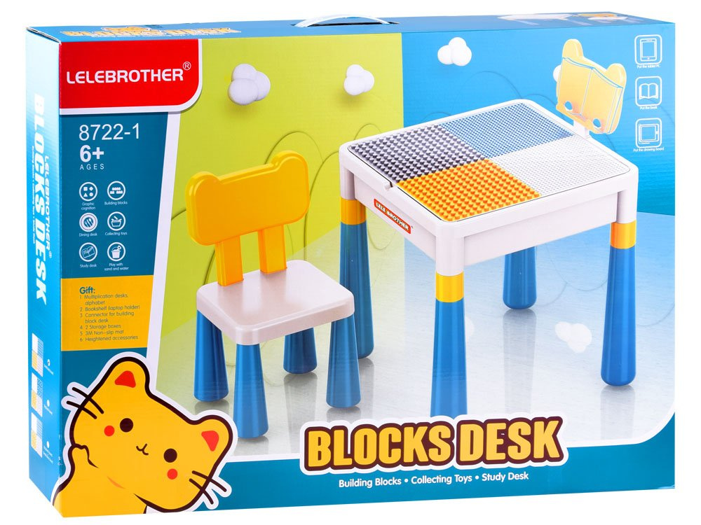 Víceúčelová sada pro dítě psací stůl 2v1 se židlí. Sada je celá vyrobena z odolného plastu v tlumených barvách. Sada má oboustrannou horní část, takže ji lze použít k více úkolům. Sada s hladkým povrchem umožní kreslení, malování, vzorování na pečivo atd. Horní část je uzpůsobena pro skládání cihel a je rozdělena do čtyř barev, aby se dobře uchopila sada skládaných cihel.